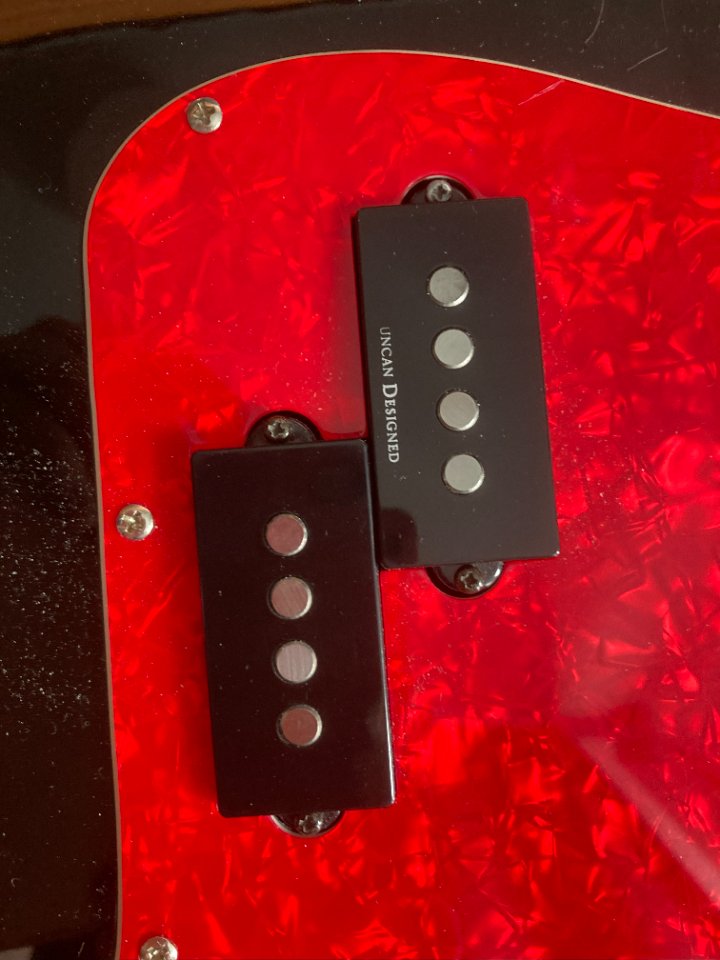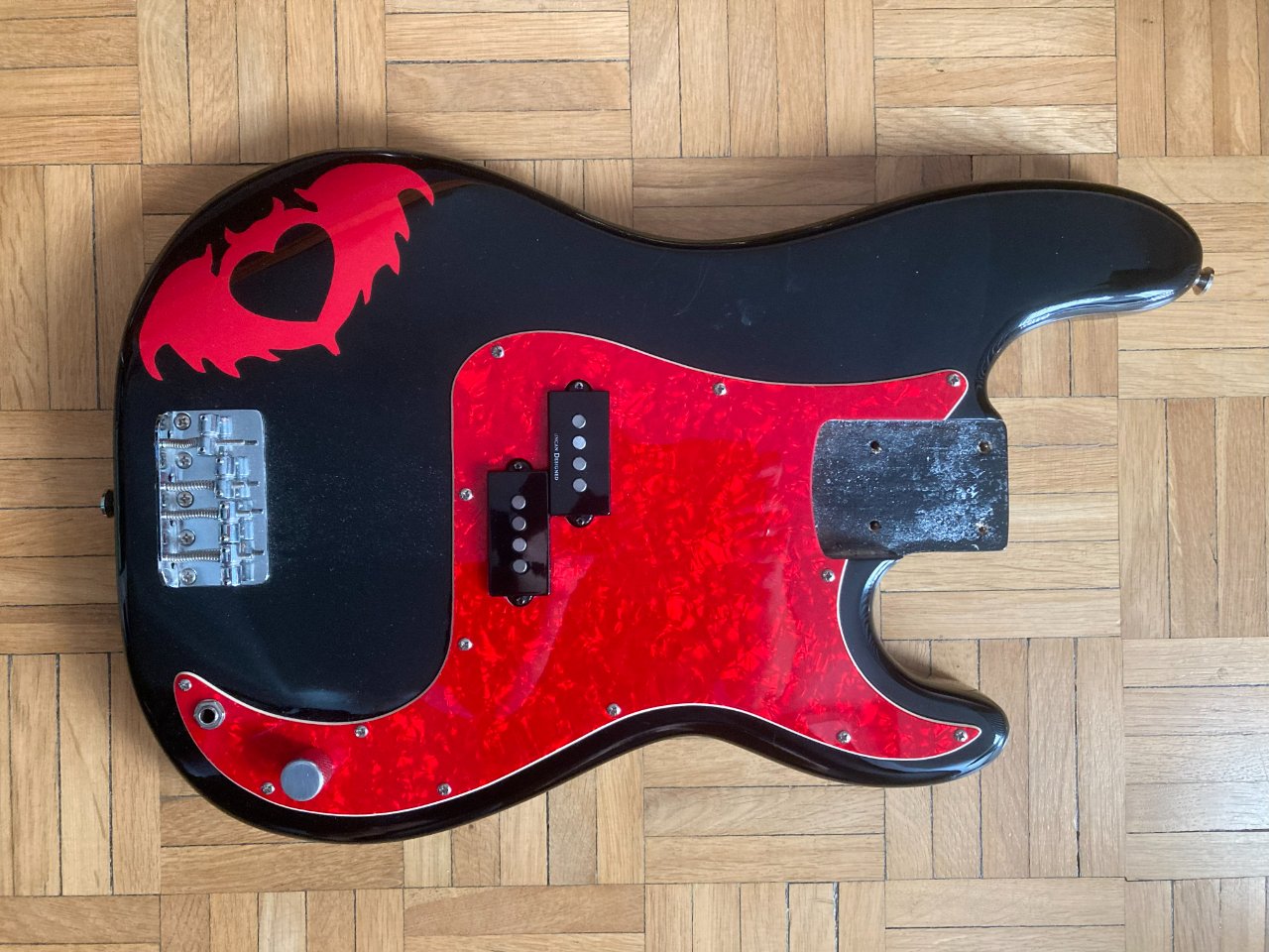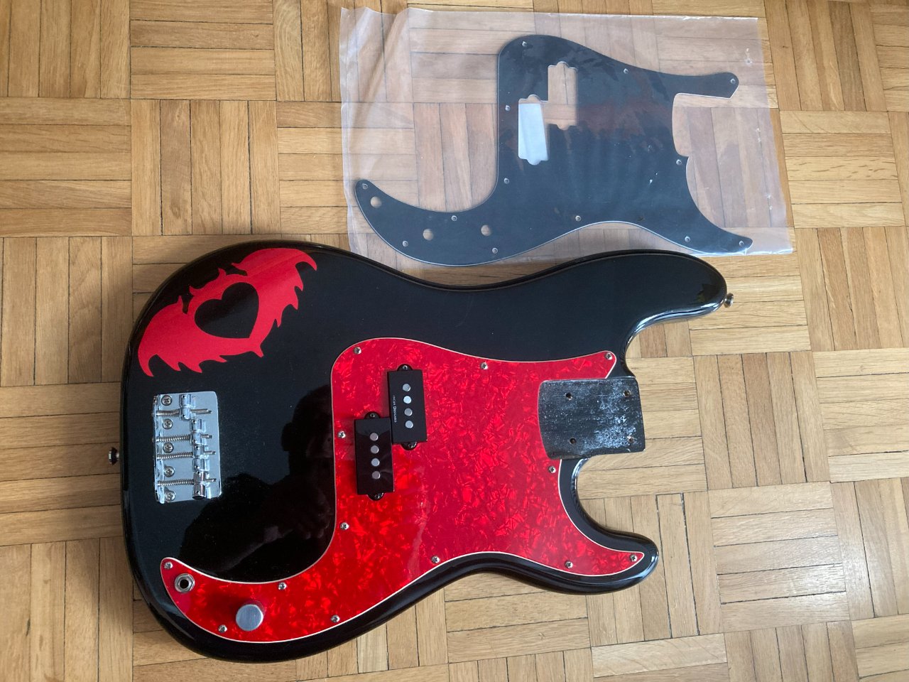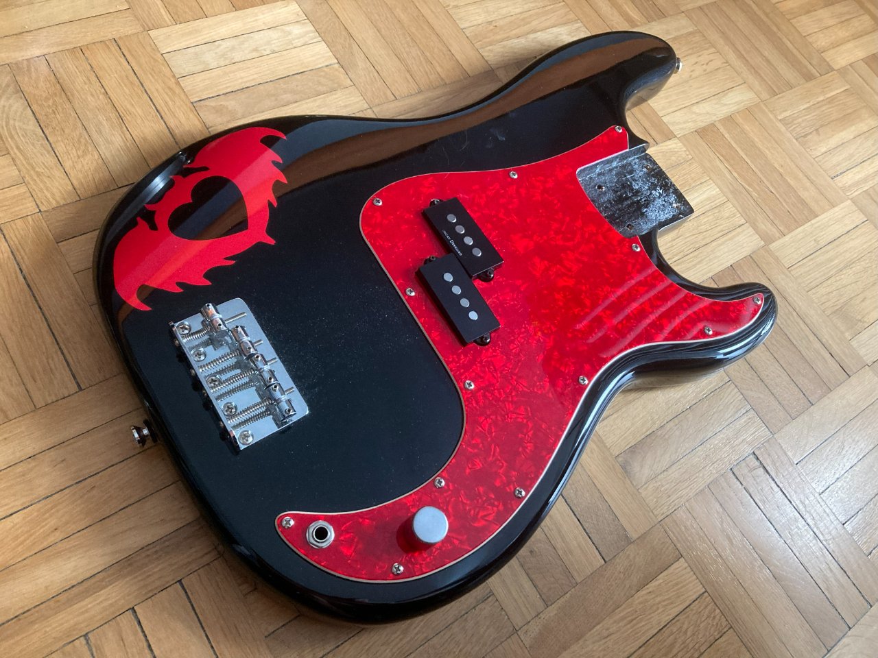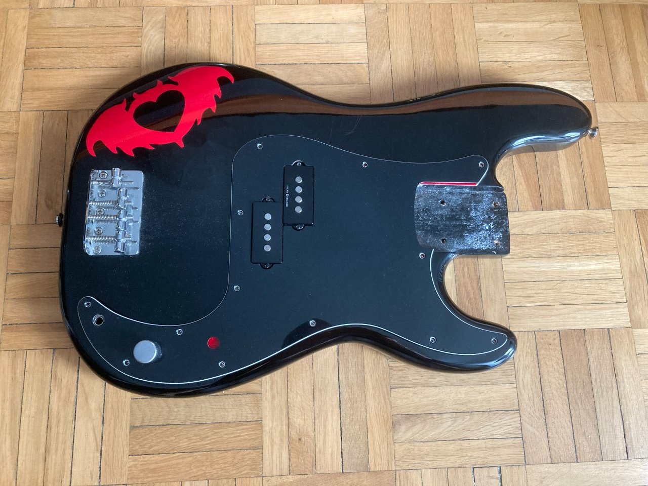 Der Body is fully loaded, der Pick-up ist ein Duncan Designed mit großen Pole Pieces, der einen kräftigen, vollen Precision Sound liefert. Die rote Fledermaus/Herz Graphik ist kein Aufkleber, sondern einlackiert. Eine weitere Besonderheit ist, dass es nur einen Volumen Poti gibt. Einfach einen gängigen Squier oder Fender Hals dranschrauben und loslegen.
