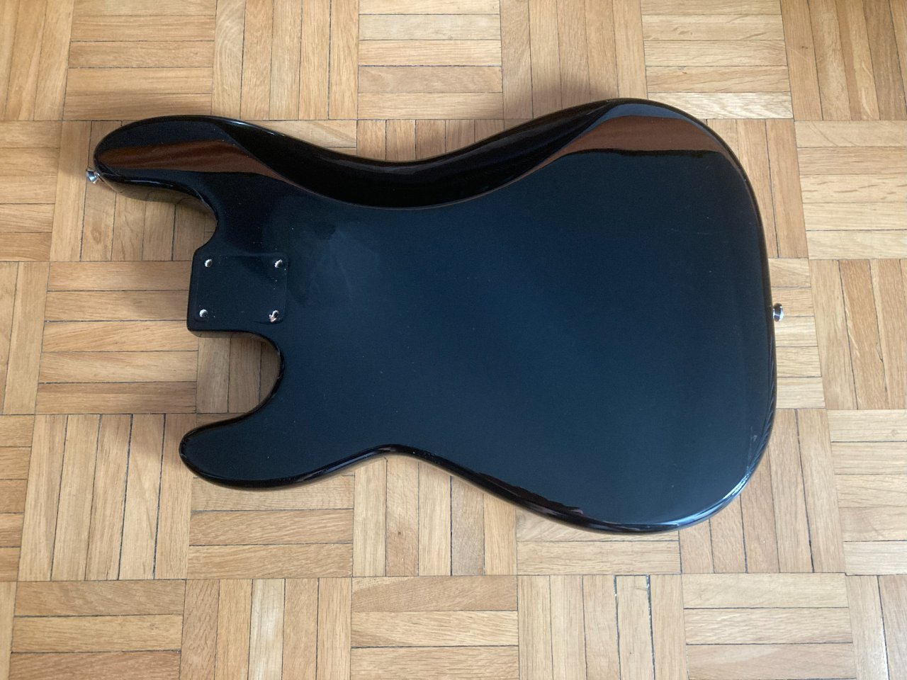 Der angebotene Squier Precision Bass Body wiegt unter 2 kg und ermöglicht mit einem Standard Hals einen Bass, der extrem leicht ist und deutlich unter 3.5 kg liegt.