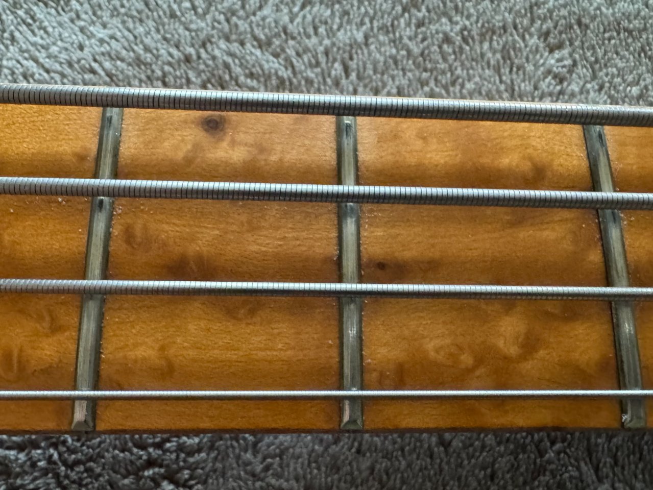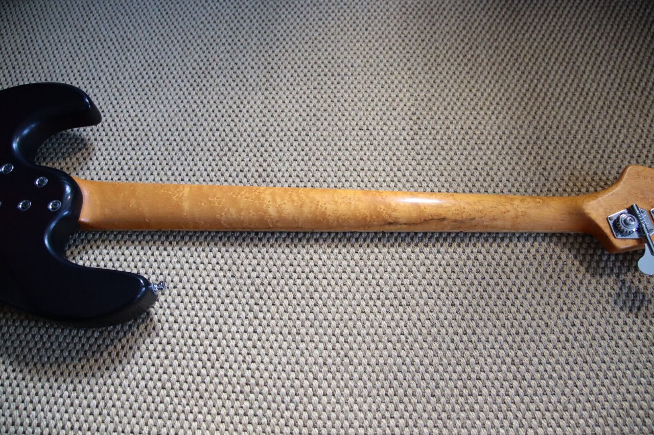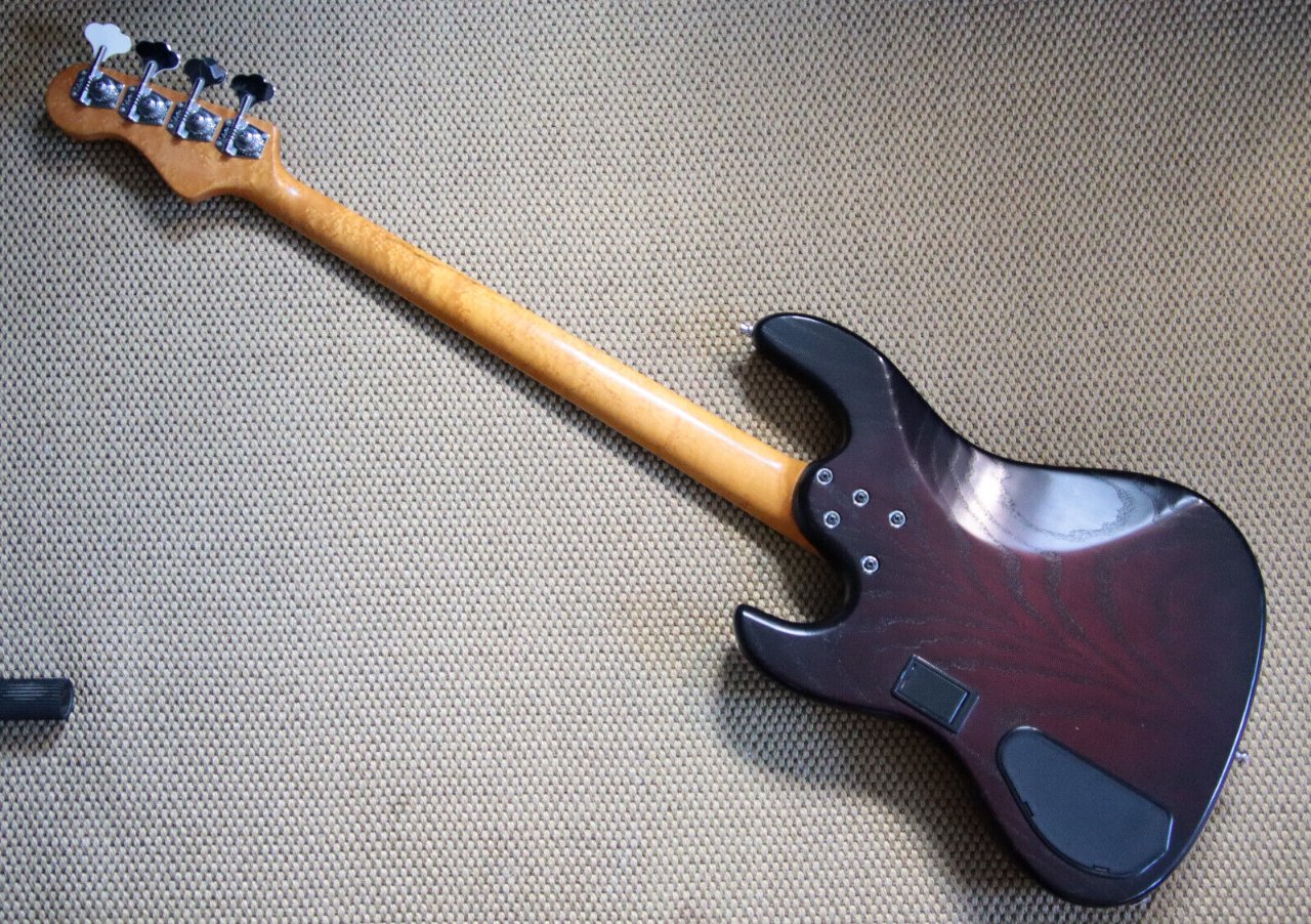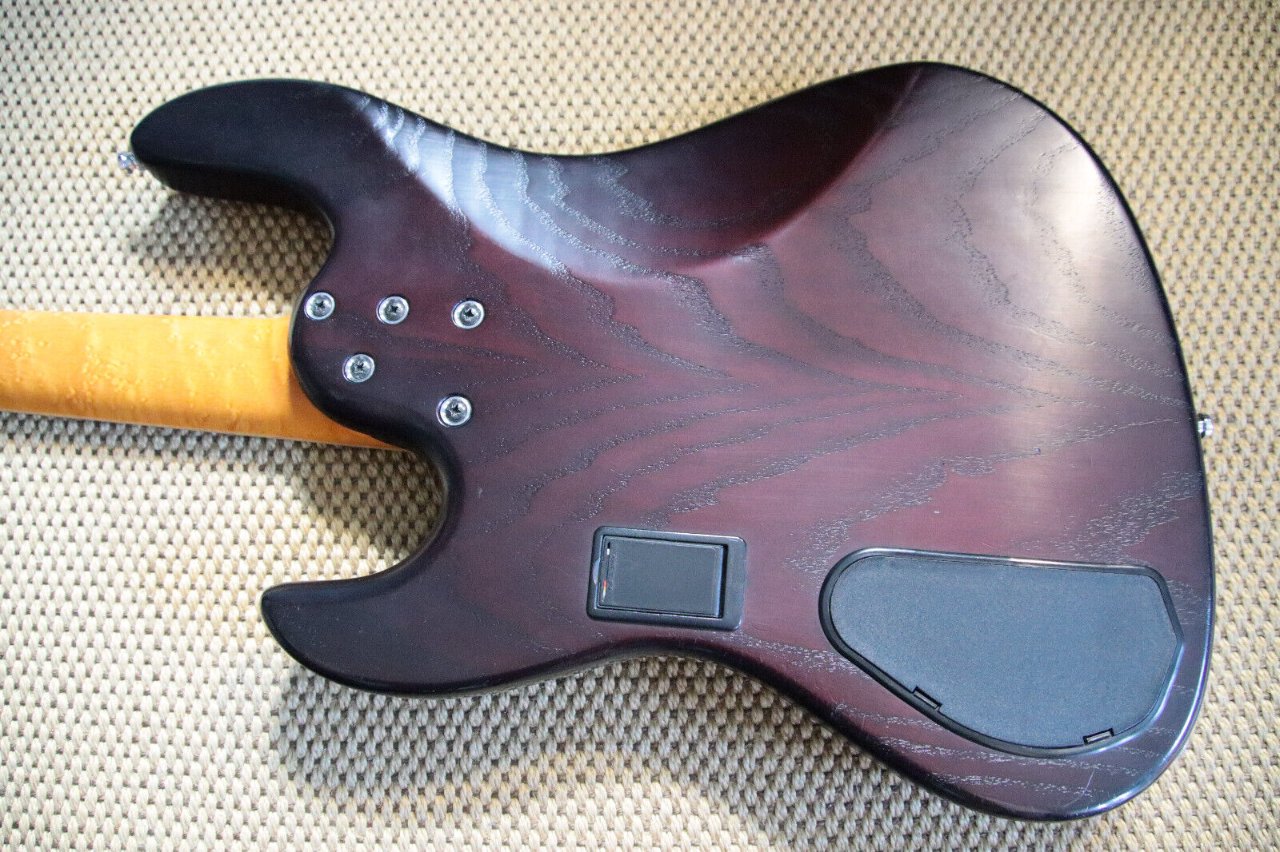 Der Korpus besteht aus hochwertiger Esche, während der Hals und das Griffbrett aus edlem Vogelaugenahorn gefertigt sind. Diese sorgfältig ausgewählten Materialien schmeicheln sowohl dem Auge als auch dem Ohr und bieten eine angenehme Spielbarkeit. Die aktive Elektronik umfasst ein Volume-Poti, eine Pickup-Blende sowie einen 3-Band Equalizer, der jedoch auch abschaltbar ist, sodass der Bass im passiven Modus gespielt werden kann. Die Elektronik ist zudem hervorragend abgeschirmt, was eine geringe Störanfälligkeit der Single-Coils garantiert. Laut Ralf verwendet er i.d.R. Häussel Pickups.