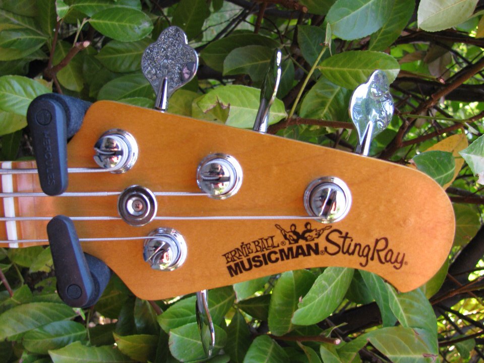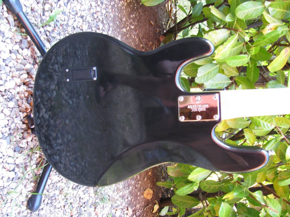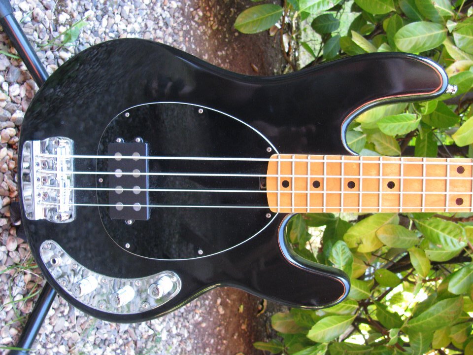 Verkaufe hier einen besonderen Stingray. Die Basis ist ein früher OLP Stingray, die damals von MusicMan lizensiert in Asien produziert wurden. Durch die fachmännisch durchgeführten Modifikationen ist er von einem USA Stingray auf den ersten und zweiten Blick nicht zu unterscheiden, und erst recht nicht vom Klang. Verbaut ist ein Häussel Pickup, geregelt von einer klassischen 2-Band Musikding Elektronik. Ich habe in all den Jahren einige Stingrays besessen, unter anderem einen 1977er pre Ernie Ball, und er kommt diesem verblüffend nah. Er klingt bei weitem klarer, dynamischer und lebendiger als meine Stingrays aus den 2000ern. Spielgefühl und Haptik sind identisch. Der Bass schwingt und klingt großartig. Kommt vorbei und überzeugt euch selbst. Der Body wurde in den frühen Baureihen wie die USA´s noch aus Esche gefertigt. Könnte auch hier der fall sein. Die gesamte Verarbeitungsqualität und der hochwertige Hals weisen jedenfalls darauf hin. Der ganze Bass wiegt 4,3/4,4 Kilo und ist damit nicht schwerer als seine amerikanischen Kollegen. Der Body wurde bereits vom Vorbesitzer sorgfältig entlackt und sehr gut neu, klassisch schwarz mit Nitrolack lackiert und poliert. Der Hals wurde von mir entlackt und wie die USA Stingrays mit True-Oil behandelt. Der Hals ist wunderschön, man erkennt auf der Halsrückseite gut die schöne Birdseyestruktur. Die Bünde sind noch annähernd voll da. Die Kopfplatte wurde sauber mit MM Decals unter Klarlack versehen. Es wurde eine neue massive MM Bridge sowie die obligatorische Sechspunktverschraubung installiert. Das Batteriefach wurde neu gefräst und ist jetzt da wo es hingehört. Alle Arbeiten wurden wie es sich gehört sauber und ordentlich durchgeführt. Der Vorbesitzer hatte die Batterie unter dem Pickguard verstaut. Die Fräsung dort wurde aber wieder verschlossen.