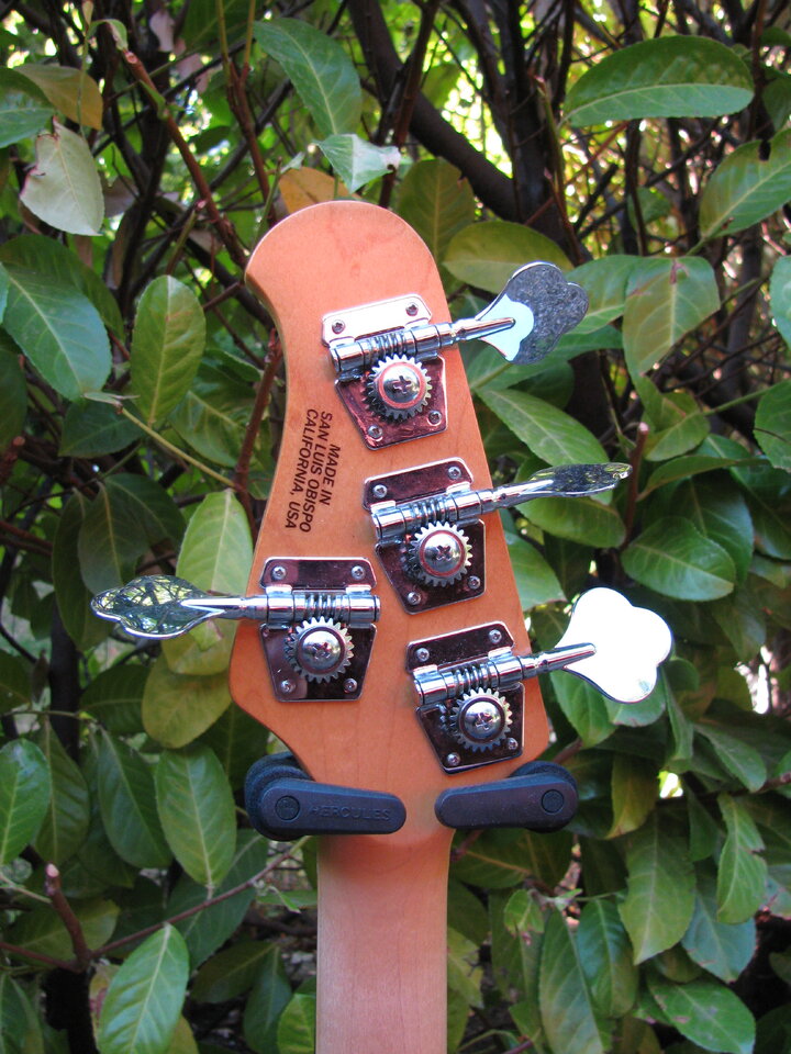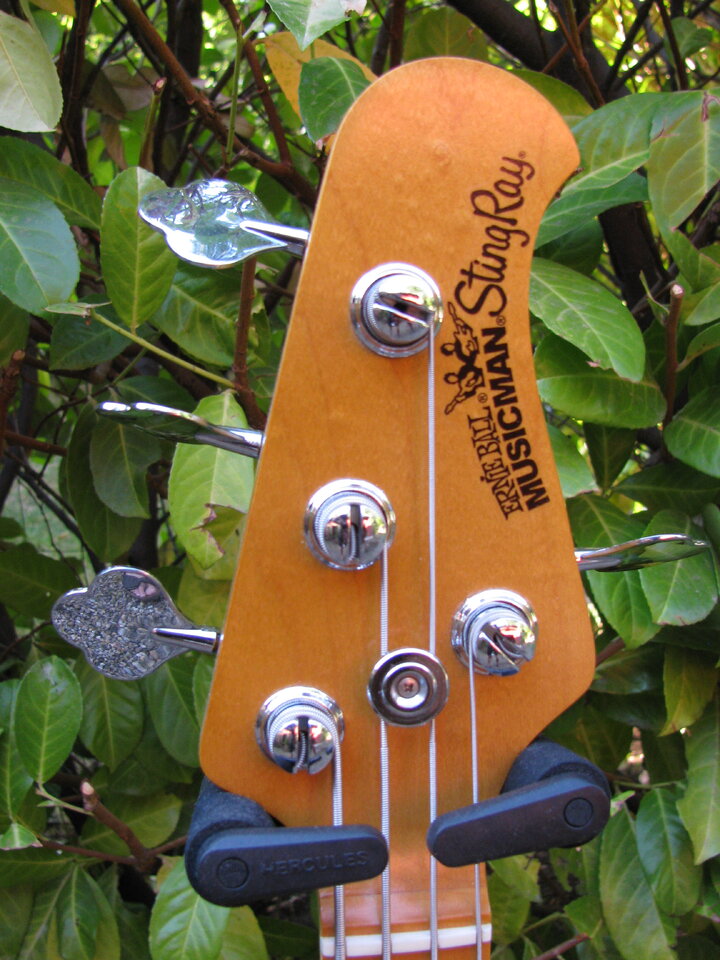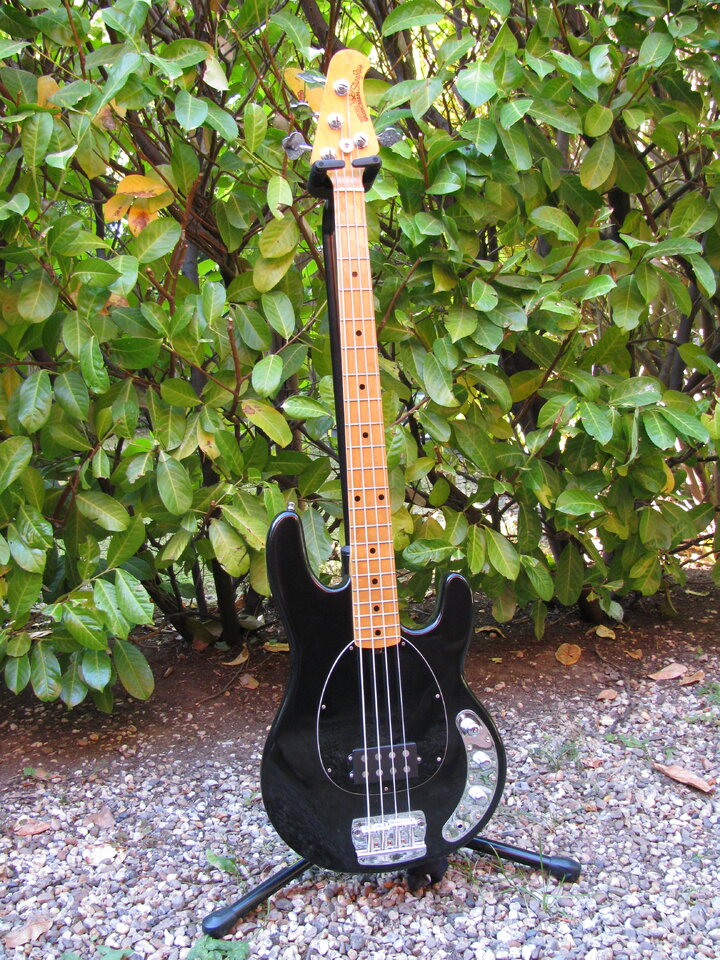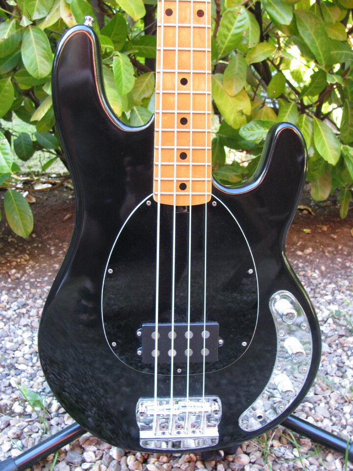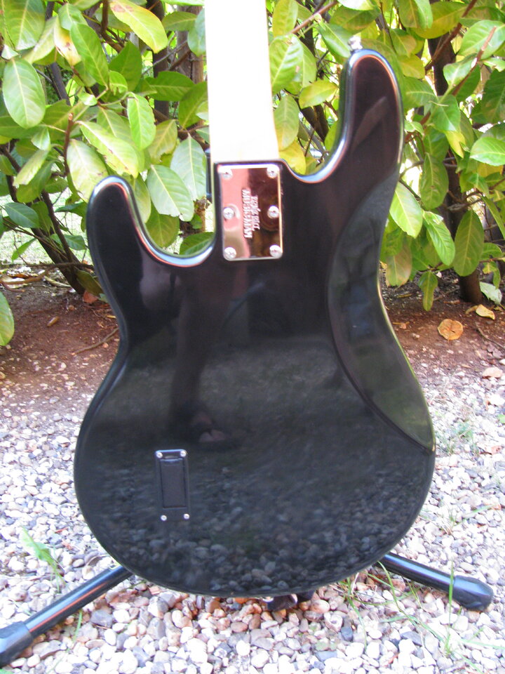 Verkaufe hier einen besonderen Stingray. Die Basis ist ein früher OLP Stingray, die damals von MusicMan lizensiert in Asien produziert wurden. Durch die fachmännisch durchgeführten Modifikationen ist er von einem USA Stingray auf den ersten und zweiten Blick nicht zu unterscheiden, und erst recht nicht vom Klang. Verbaut ist ein Häussel Pickup, geregelt von einer klassischen 2-Band Musikding Elektronik. Ich habe in all den Jahren einige Stingrays besessen, unter anderem einen 1977er pre Ernie Ball, und er kommt diesem verblüffend nah. Er klingt bei weitem klarer, dynamischer und lebendiger als meine Stingrays aus den 2000ern. Spielgefühl und Haptik sind identisch. Der Bass schwingt und klingt großartig. Kommt vorbei und überzeugt euch selbst. Der Body wurde möglicherweise damals noch aus Esche gefertigt. Die gesamte Verarbeitungsqualität und der hochwertige Hals weisen darauf hin. Der ganze Bass wiegt 4,3/4,4 Kilo und ist damit nicht schwerer als seine amerikanischen Kollegen. Der Body wurde bereits vom Vorbesitzer sorgfältig entlackt und neu klassisch schwarz mit Nitrolack lackiert. Hat er gut hingekriegt. Der Hals wurde von mir entlackt und wie die USA Stingrays mit True-Oil behandelt. Man erkennt auf der Halsrückseite gut die schöne Birdseyestruktur. Die Bünde sind noch annähernd voll da. Die Kopfplatte wurde sauber mit Decals unter Klarlack versehen. Es wurde eine neue massive MM Bridge sowie die obligatorische Sechspunktverschraubung installiert. Das Batteriefach wurde neu gefräst und ist jetzt da wo es hingehört. Alle Arbeiten wurden wie es sich gehört sauber und ordentlich durchgeführt. Der Vorbesitzer hatte die Batterie unter dem Pickguard verstaut. Die Fräsung dort wurde aber wieder verschlossen.