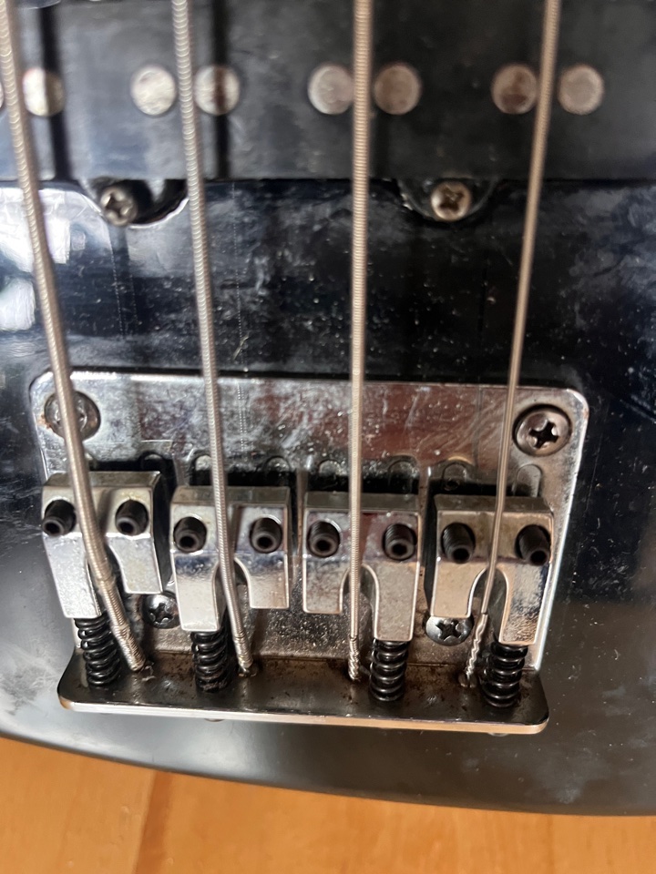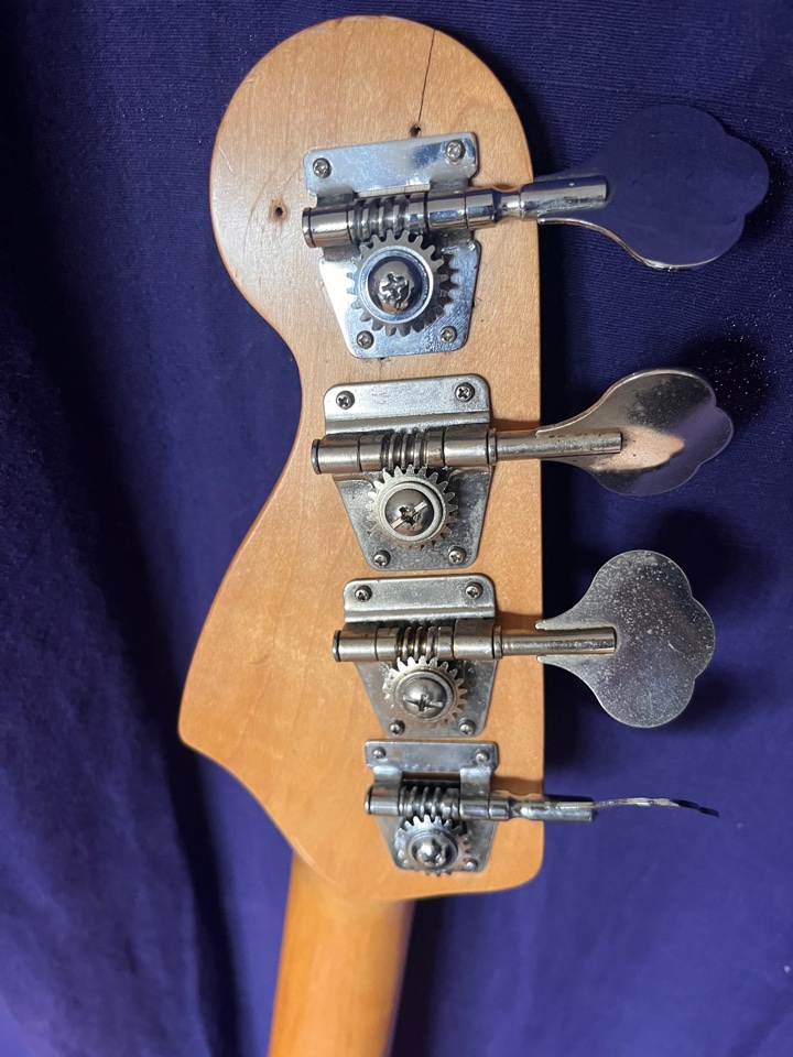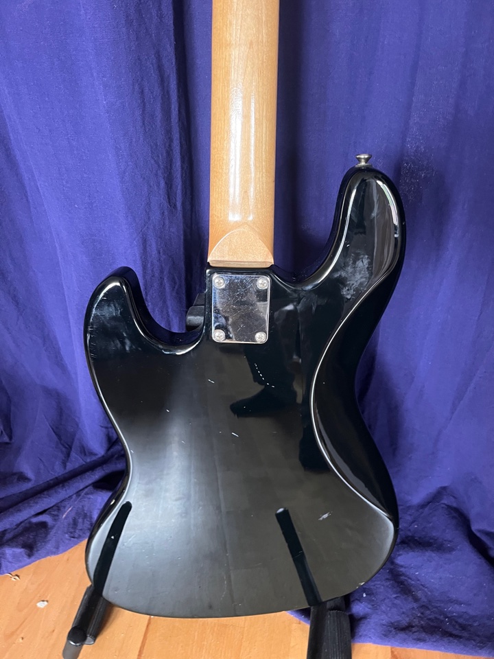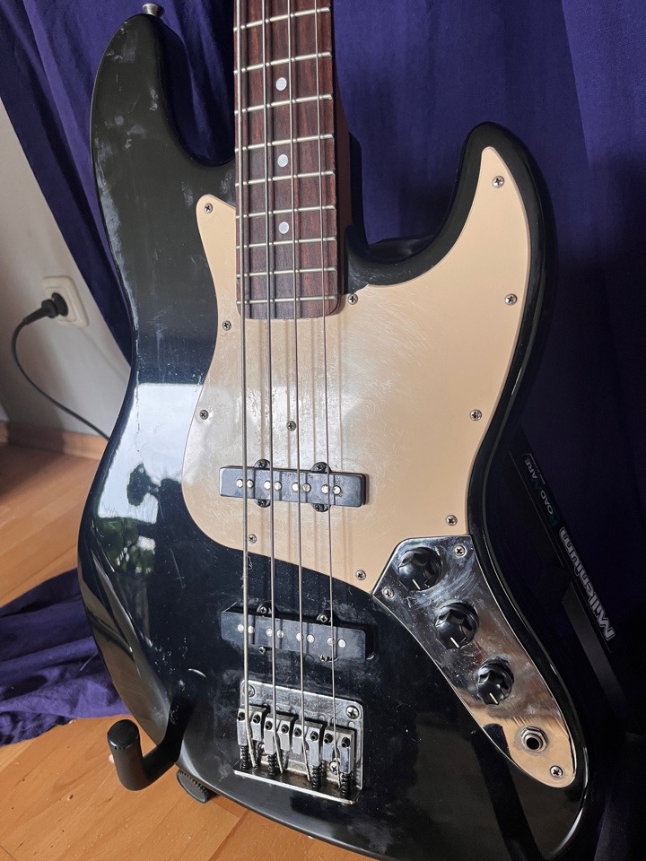 gute 90er Jahre Kopie des Klassikers - wahrscheinlich 1996 Japan oder Korea. Ahorn Hals, Korpus schwarz (Holz massiv aber keine Ahnung, welches Holz), 4500 gramm, Bünde sehr gut, Elektronik funktioniert, Saitenlage gut, Halsstab gut, massive Brücke. Hier zum Tausch gerne gegen eine gute Stingray Kopie oder einen Kontrabass