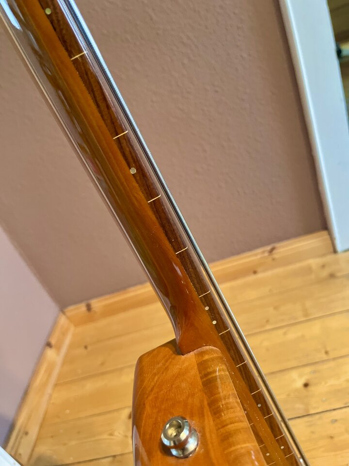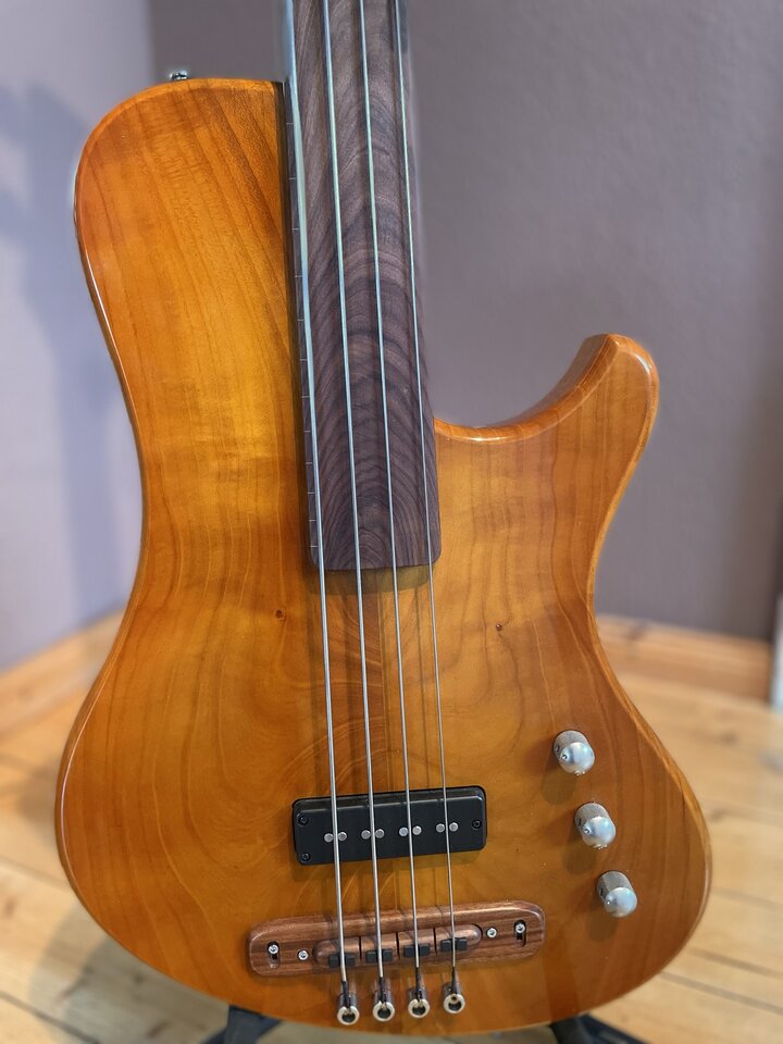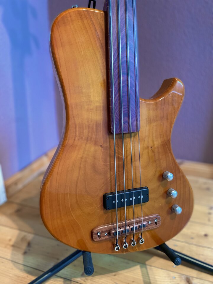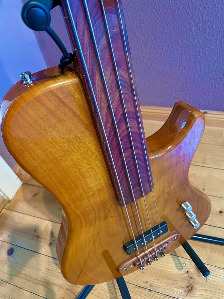 Fretless mit Cherry Body (aus eigenem Garten, kein Witz, habe das Holz 7 Jahre lang trocknen lassen und abgewartet).