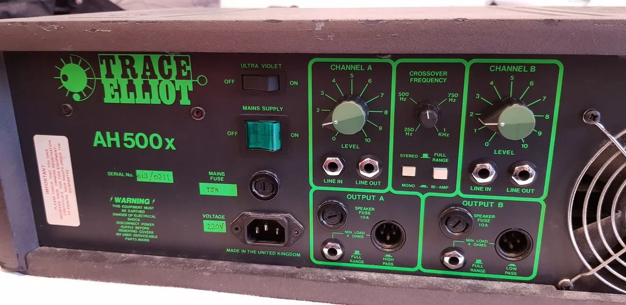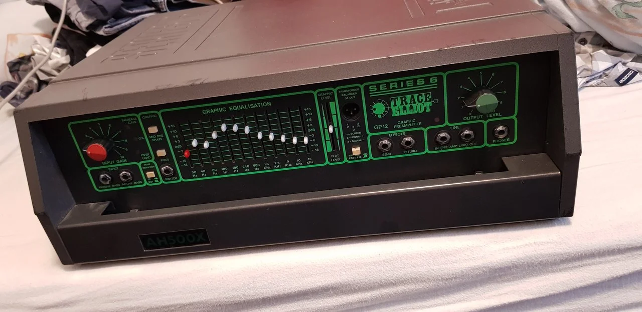 Biete gut erhaltenen Trace Elliot AH500X mit Fußschalter für Pre-Shape und graphischen Equalizer, sowie Netzteil an. Zusätzlich gibt es die passende Lederhülle für den Amp dazu. Der Amp hat ein paar Kratzer (ist dem Alter geschuldet), allerdings ist er technisch einwandfrei und alle Potis und Regler sind Original.