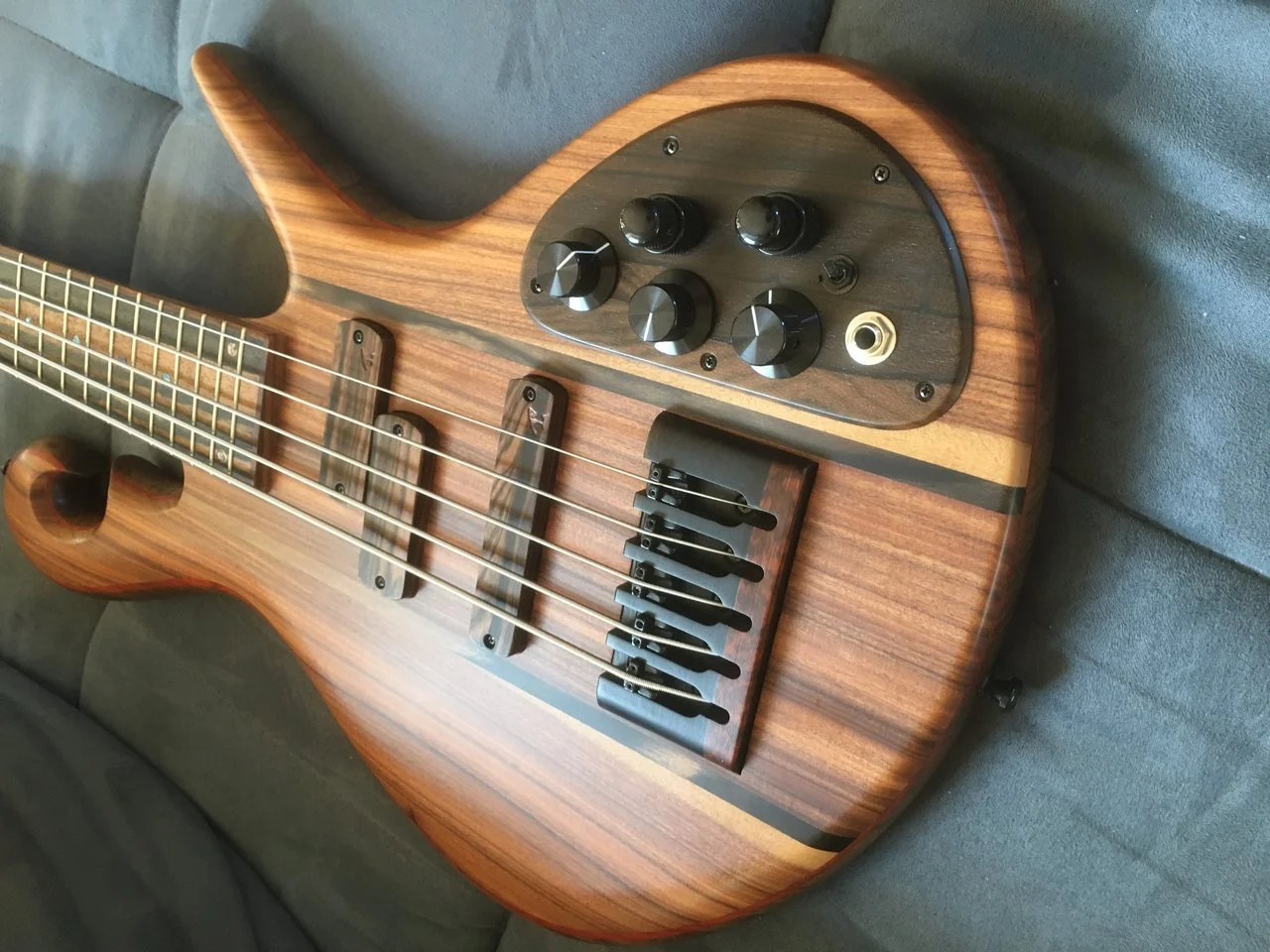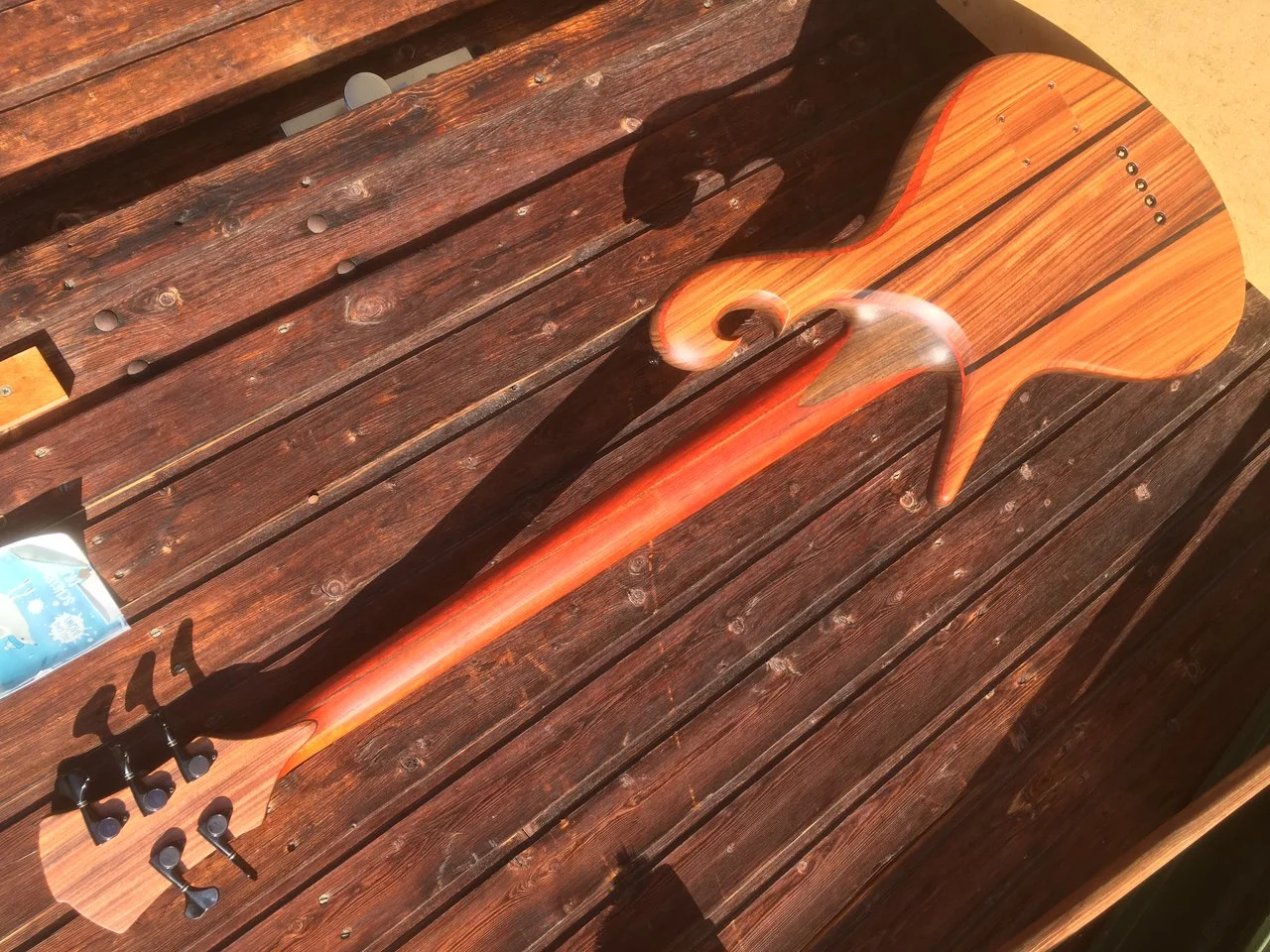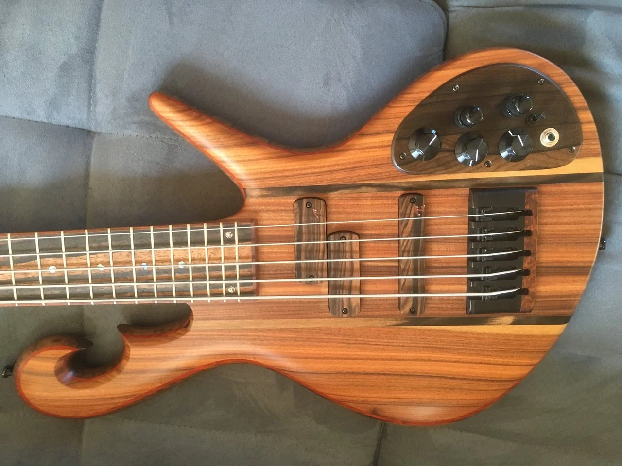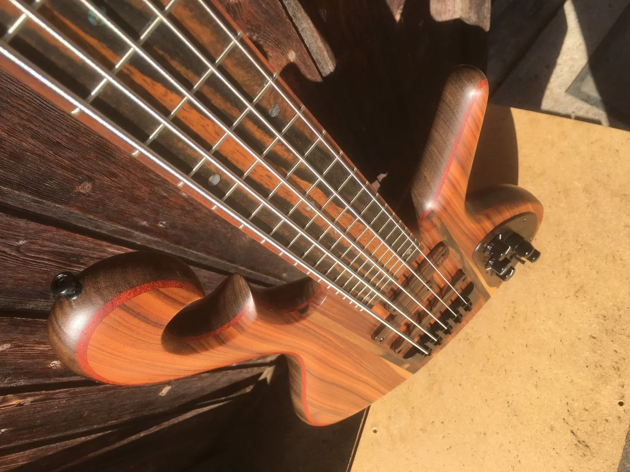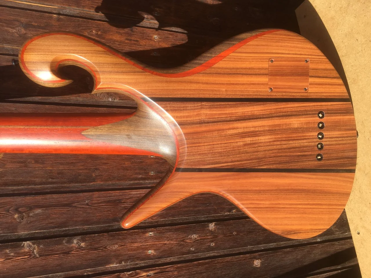 Body aus Ovancgol mit closed Top und closed Back aus Pau Ferro mit jeweils Padouk-Layer dazwischen.