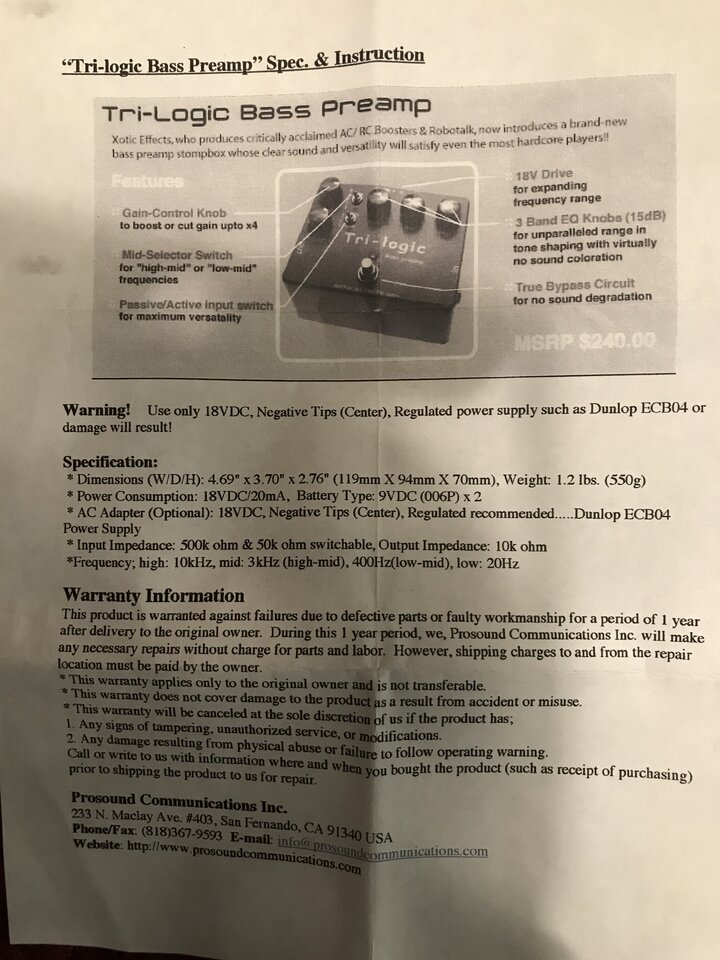 Zum Verkauf steht ein original Tri-Logic Bass Preamp von xotic effects.
