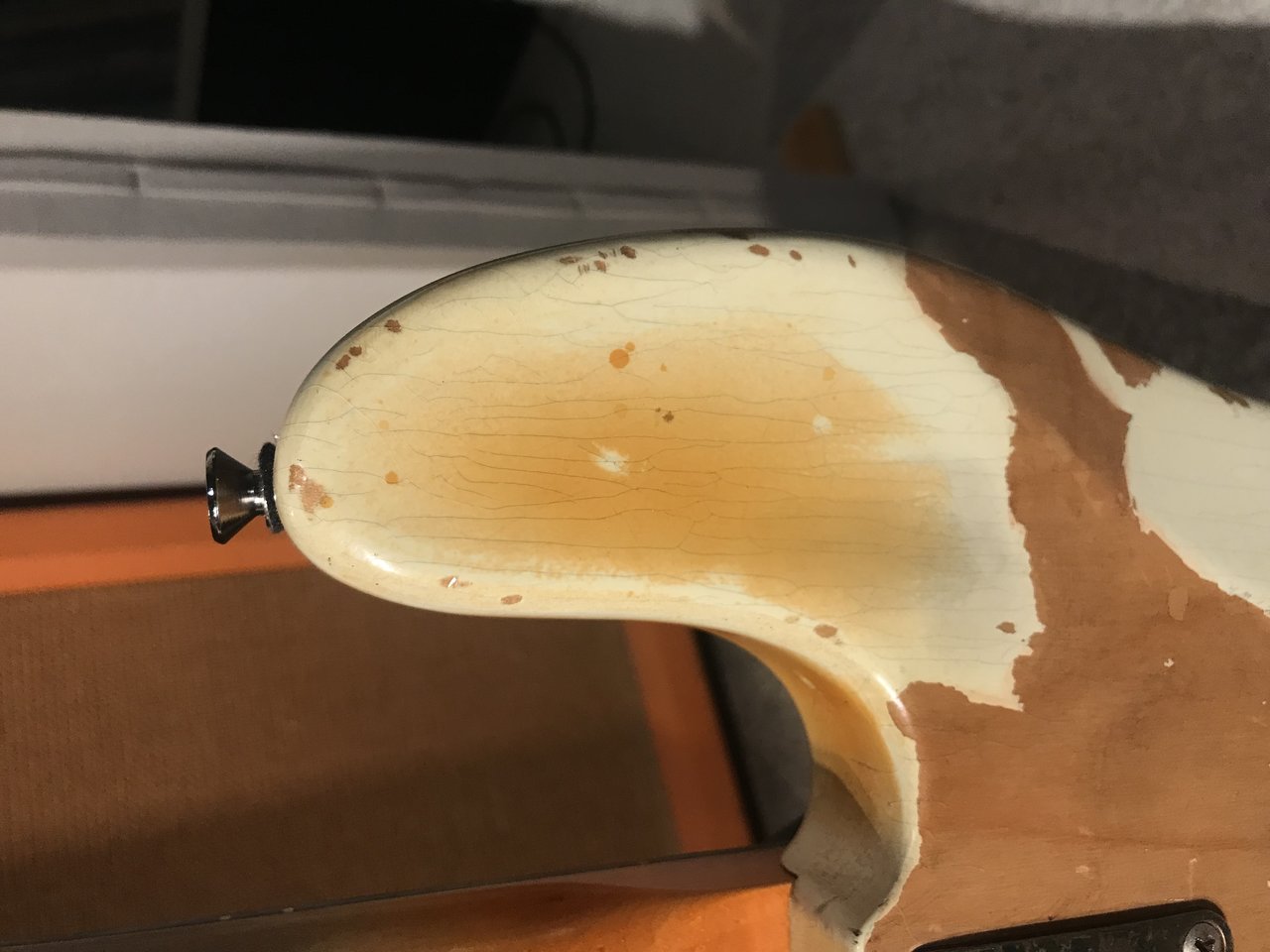 Aged olympic white, Lackabplatzungen, vergilbt, heavy relic.