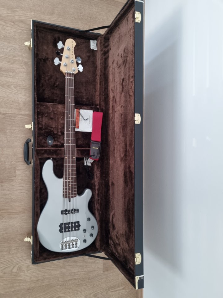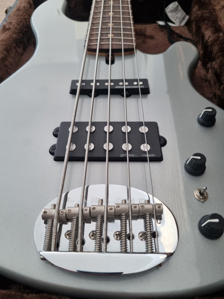 For sale: a five-string USA LAKLAND 55-14 CLASSIC bass guitar in Inca Silver finish. Year of manufacture: 2021. The instrument is in perfect condition and looks like new - it was used as a DEMO.