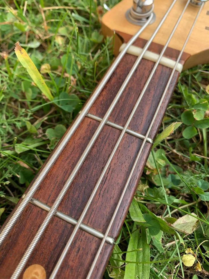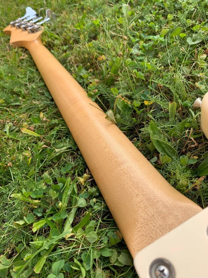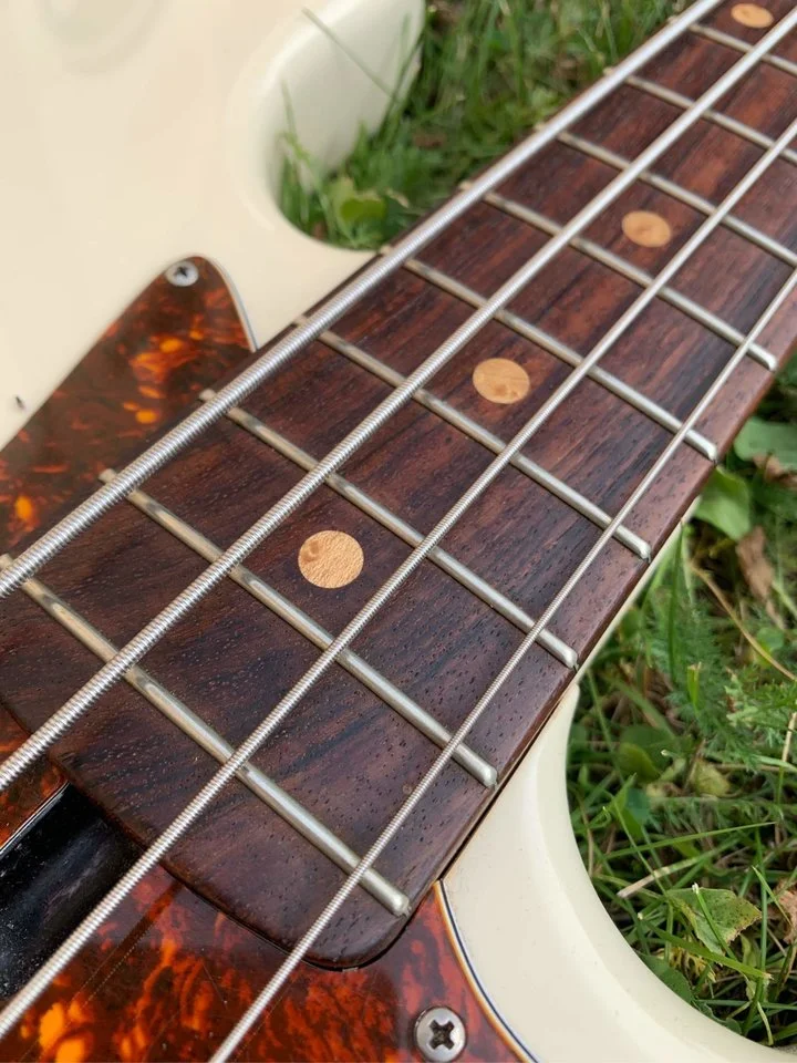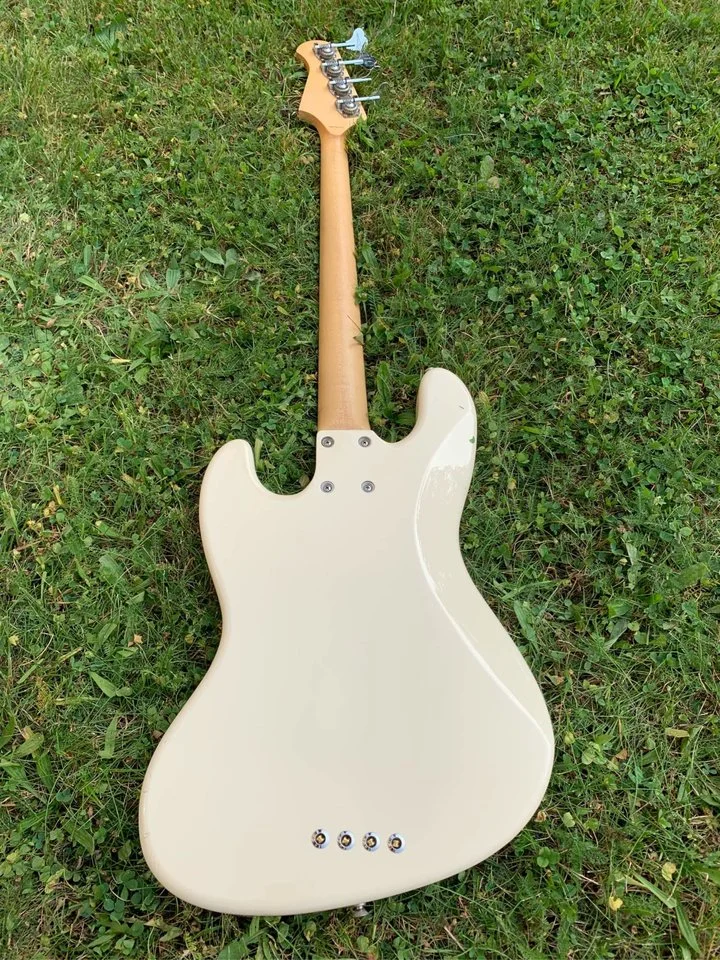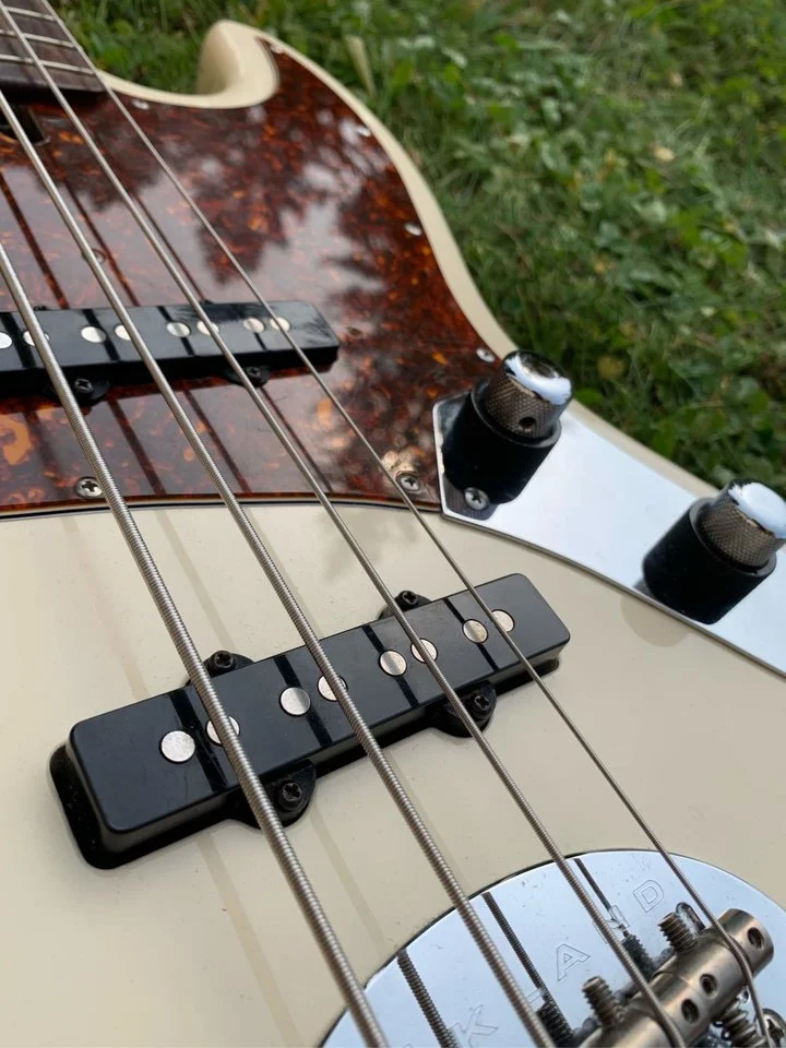 This particular bass it classic of all classics - Olympic white finish on alder body, maple neck with rosewood fretboard. Neck, as usual with Laklands, is absolute joy to play - profile is great, fingerboard edges are round and oil/wax back feels like and old gloves. Quartersawn here is dead straight and tight, fretboard has beautiful chocolate coloration.