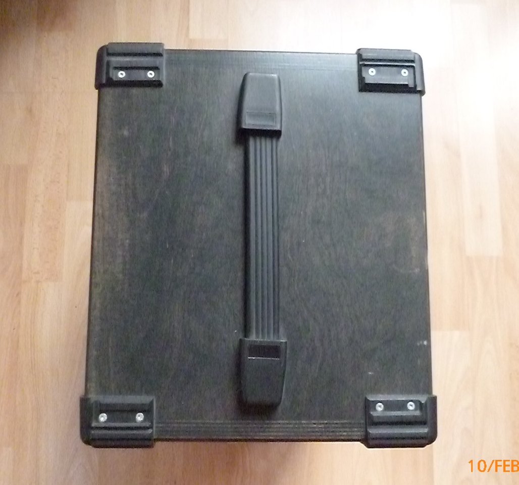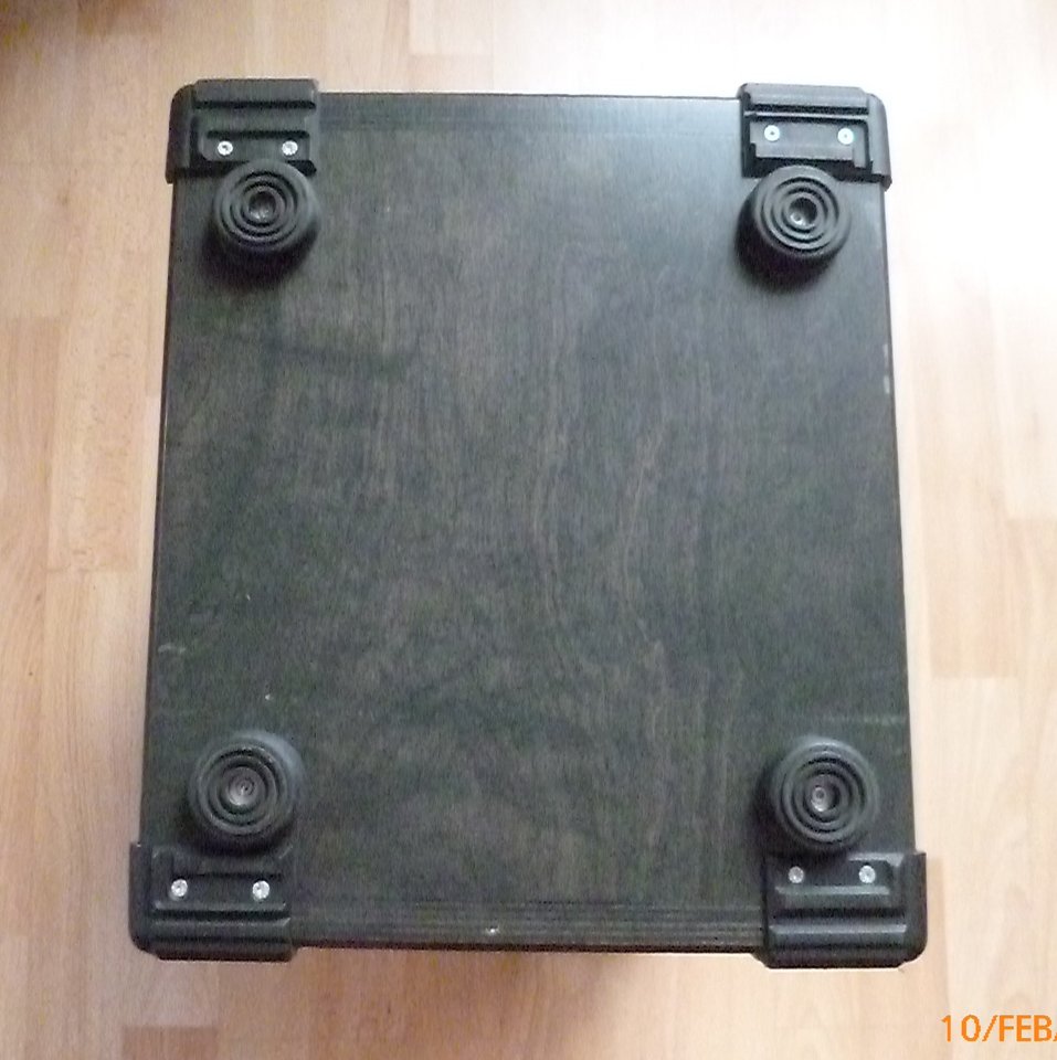 Unter die eine Längsseite habe ich zusätzliche Füße angebracht, damit die Box auch quer stehen kann und der Tragegriff einem Amp nicht im Wege steht. Das Gehäuse ist einfach lackiert und hat ein paar kleine Schrammen.