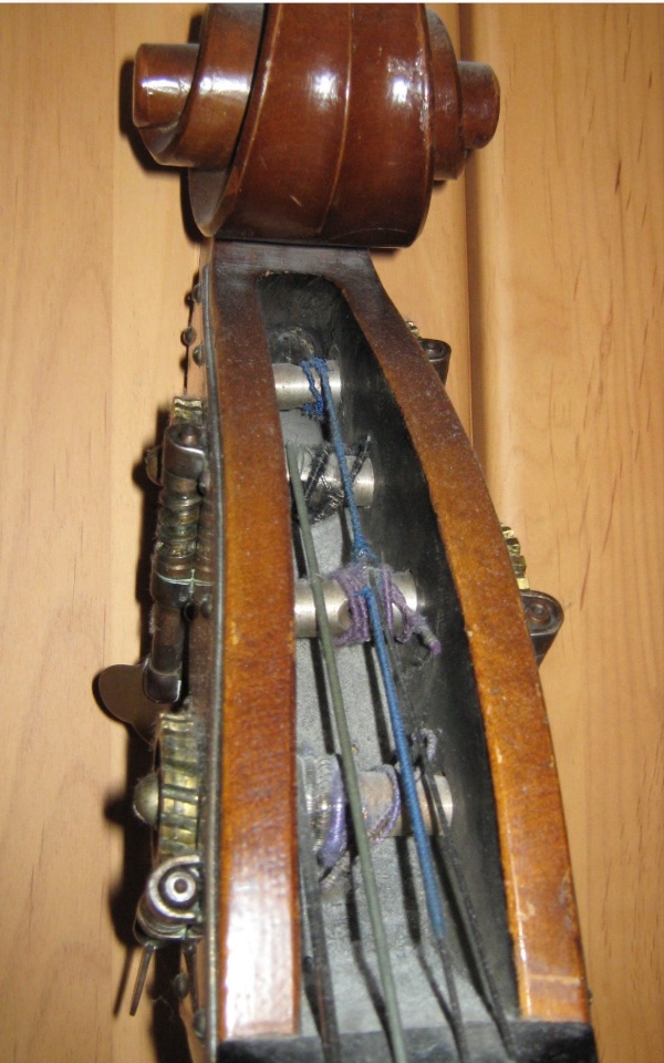 Den hatte er allerdings schon, als ich ihn gekauft habe, tut dem guten Ton aber keinen Abbruch. Ein versierter Geigenbauer kann das im Bedarfsfall sicherlich auch wieder ordnungsgemäß instandsetzen. Wie gesagt, mich hat's auch nie gestört und der Bass hat trotz alledem einen excellenten Ton.