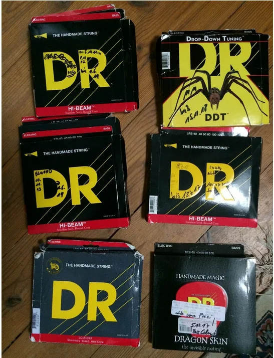 Aloah Tieftönergemeinde , ich hab ´nen Schuhkarton gebrauchte DR E-Bass Saiten ganze 8 Sätze für 4 und 5 Saiter: