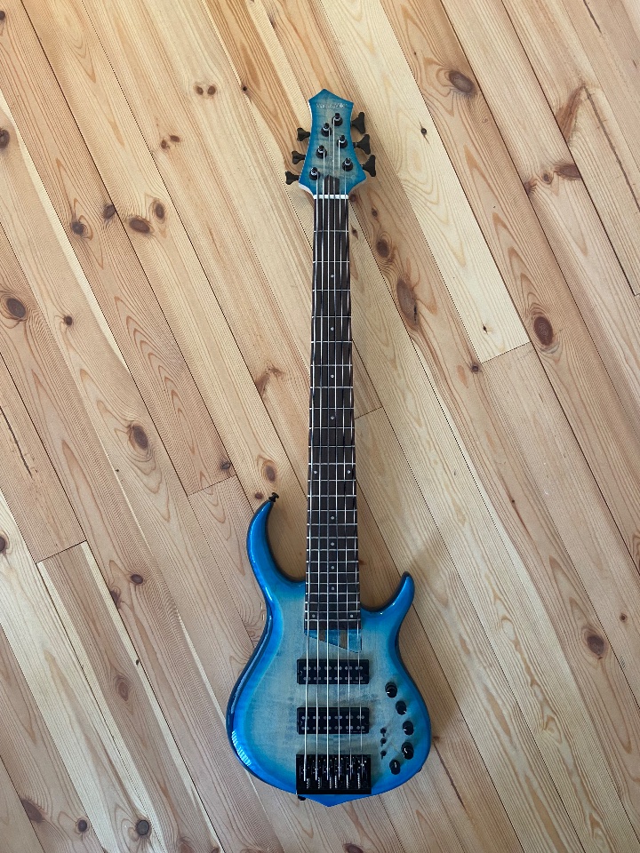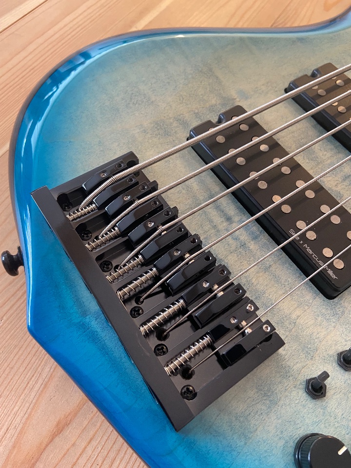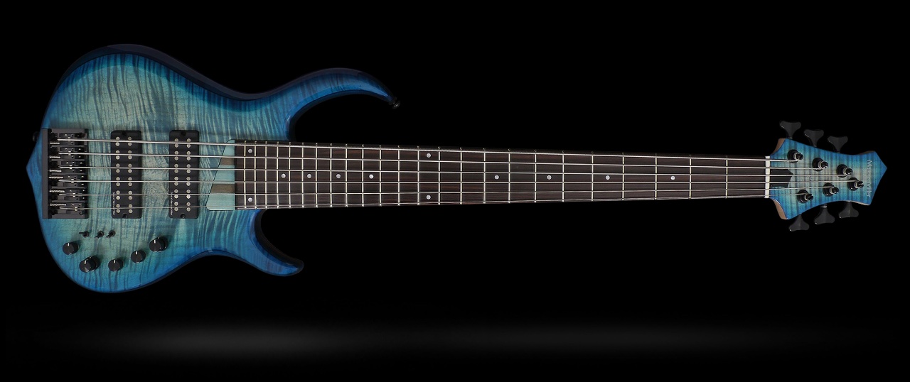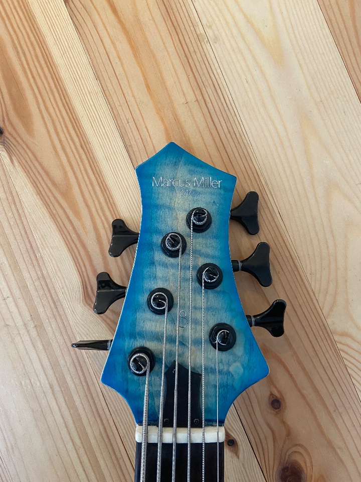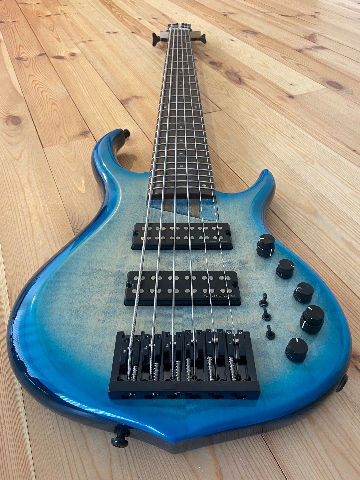 Marcus Miller M7-6 TBL:6-Saiter E-Bass made by Sire, Erle Korpus, geflammte Ahorndecke, geschraubter Ahorn/ Walnuss Hals, C Halsprofil, 889 mm Extra Long Scale, Ahorn Griffbrett, Dot Inlays, 305 mm Radius, 24 Medium Bünde, 2x Marcus Miller Pure Humbucker, Marcus Heritage-3 Elektronik mit Frequency Control, Volume/Tone (Dual Pot), Pickup Blender, Treble, Middle/Middle Frequency (Dual Pot), Bass Mini Toggle (Active/Passive), mit 2x 9V Batterien, Marcus Miller Custom Big Mass2 Brücke, schwarze Hardware, Finish: Transparent Blue.