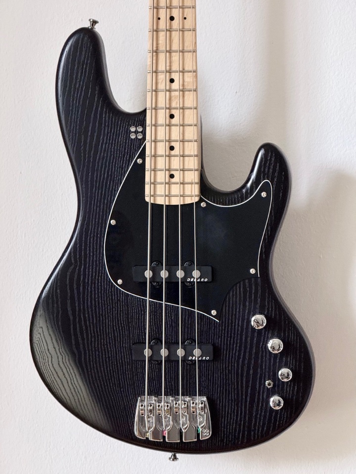 Der Bass besitzt einen sehr schön und gleichmäßig gemaserten Body aus europäischer Esche, matt lackiert. Eine Besonderheit dieser Ausführung ist das rückseitige Elektronikfach. Abgesehen vom Pickguard, dass die typischen Spielspuren aufweist, muss man Gebrauchsspuren suchen. Keine auffälligen Macken, Kratzer, Dellen, Kerben.