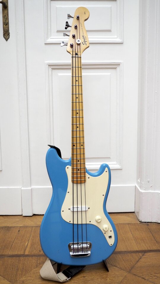 Hier ein Squier Bronco Bass 2006. Er wurde mit Nitrolack in Daphne Blau lackiert, der Hals mit klarem Nitrolack. Der Farbton auf den Fotos ist etwas zu satt, eher ein blasseres Blau. Als Pickup ist ein Lace Sensor Red eingebaut - einer meiner Lieblingpickups für Bronco- oder Musicmasterbässe. Ohne Nebengeräusche und kräftiger Klang.