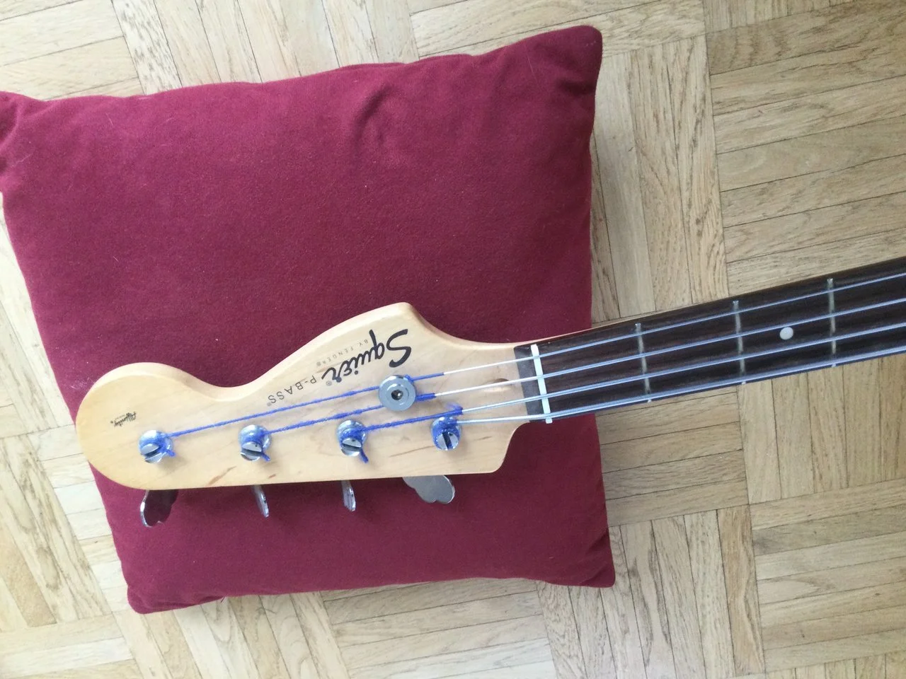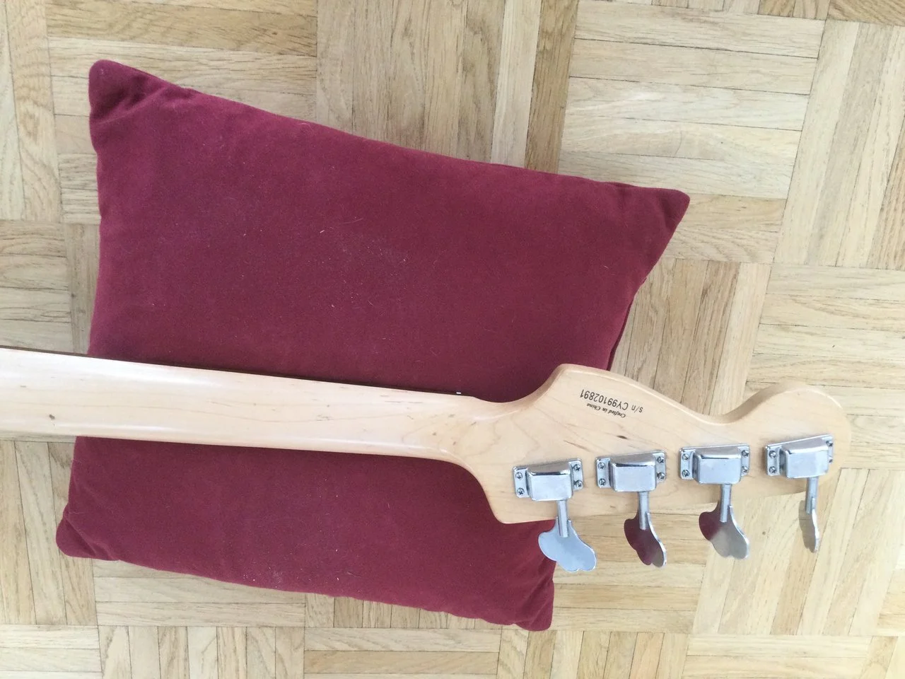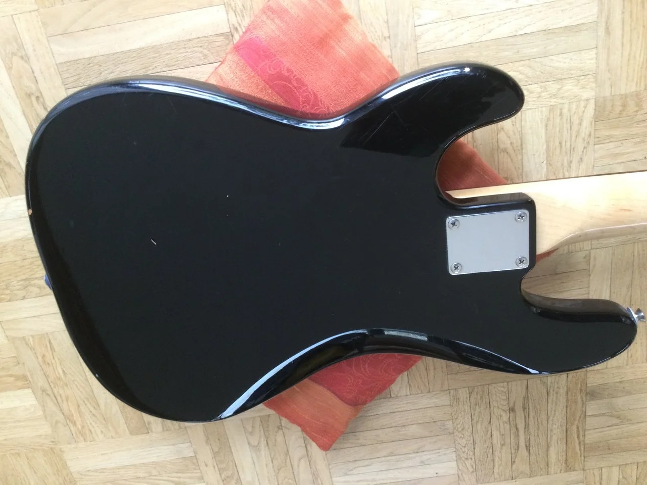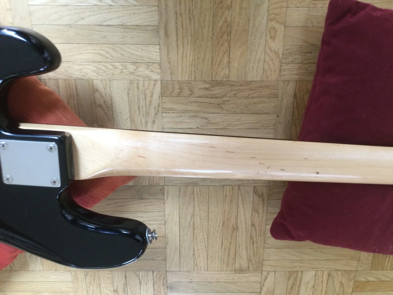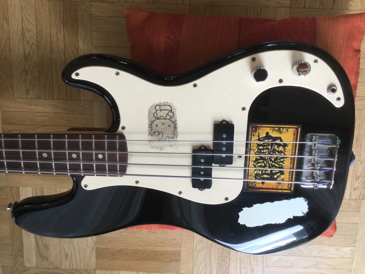 Ich miste aus und biete o.g. Bass zum Verkauf, da ich ihn praktisch nicht spiele. Er wurde vom Vorbesitzer ordentlich gerockt und weist dementsprechend diverse, echte Spielspuren auf (siehe Fotos). Technisch in Ordnung- Hals gerade, Bünde u.Trussrod ok, minimal kratzendes Volume-Poti. Die Aufkleber (auch die breite helle Stelle nahe der Bridge) lassen sich vermutlich entfernen, das Pickguard hat im Bereich der Klinkenbuchse einen Riss und das Griffbrett könnte wohl mal etwas Öl vertragen... Besaitet mit d´Addario Chromes (45/105), die Original-Potiknöpfe fehlen, Ersatz lege ich bei. Coronakonformes Testen bzw. Versand nach Absprache. Der Kaufpreis ist in vernünftigem Rahmen verhandelbar. Bei Fragen, fragen!