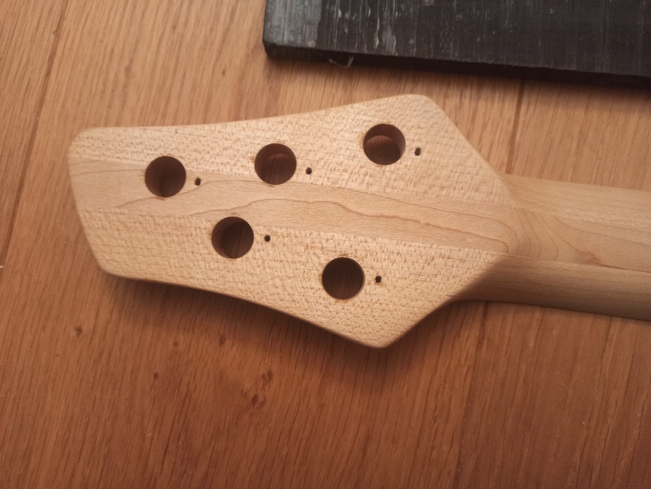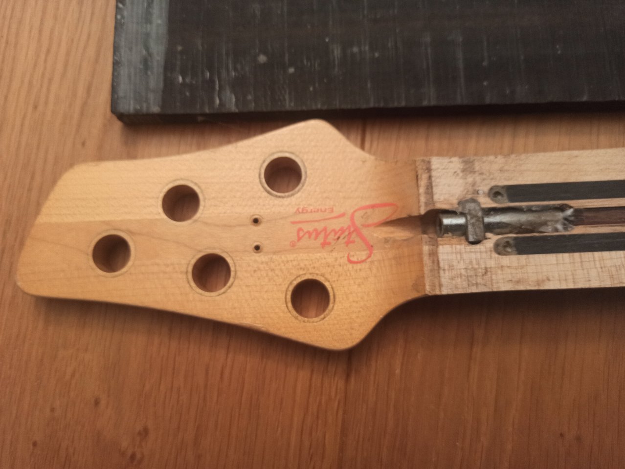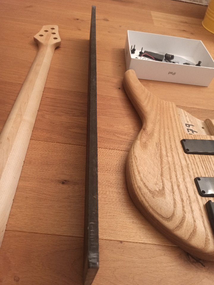 So, irgendwann ist´s mal gut gewesen, da ich nur noch Bässe mit 16,5-17mm Stringspacing spiele, habe ich komplett die Motivation verloren den Bass fertig zu bauen. Ich hatte den Status vor ein paar Jahren gekauft, irgendwie war mir dann der Hals zu dünn. Also die glorreiche Idee gehabt, das Griffbrett runter zu nehmen, um dann ein fettes Ebenholz fretless Griffbrett drauf zu bauen. Soweit so gut.