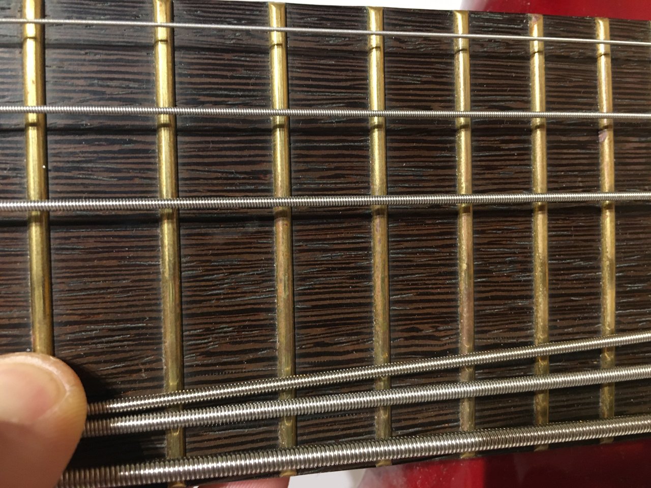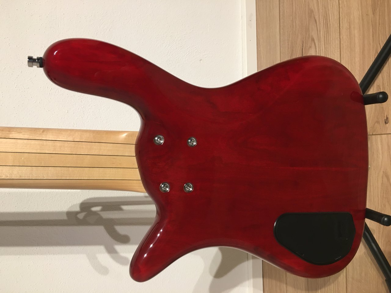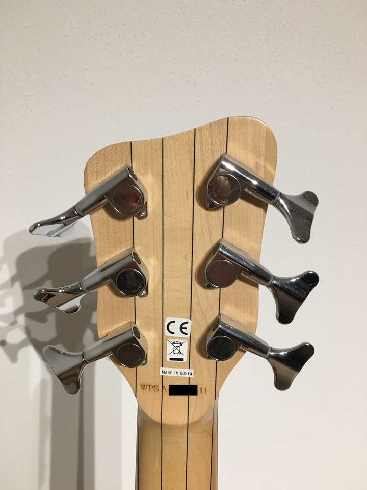 Er wurde nicht nur zuhause gespielt und hat kleinere Spielspuren. Des Weiteren sind einige Kratzer auf der Kopfplatte (siehe Bild) und die höheren Bünde sind im Bereich der tiefen Saiten trüb / nicht glänzend (siehe weiteres Bild). Ersteres war meinerseits ein Unfall mit einem Gurt & Straplock im Gigbag – stört mich selbst nicht weiter, lässt sich gegebenenfalls mit etwas schwarzer Farbe beheben. Letzteres war beim Neukauf (ich bin der Erstbesitzer, Kauf war 2014) bereits so; der Makel ist rein optisch, beeinträchtigt den Sound und die Bespielbarkeit nicht. Ansonsten funktioniert alles einwandfrei und der Bass lässt sich super bespielen.