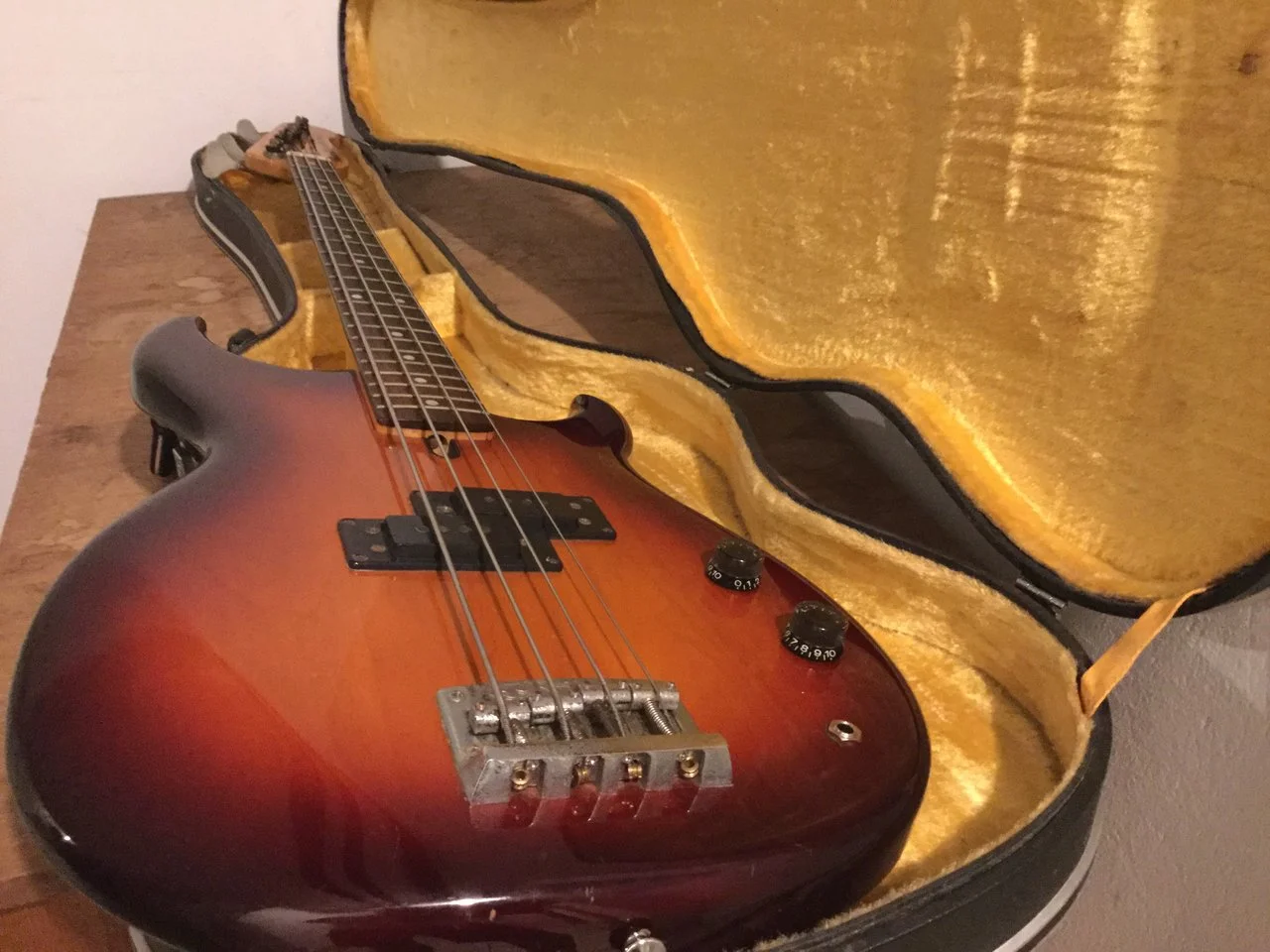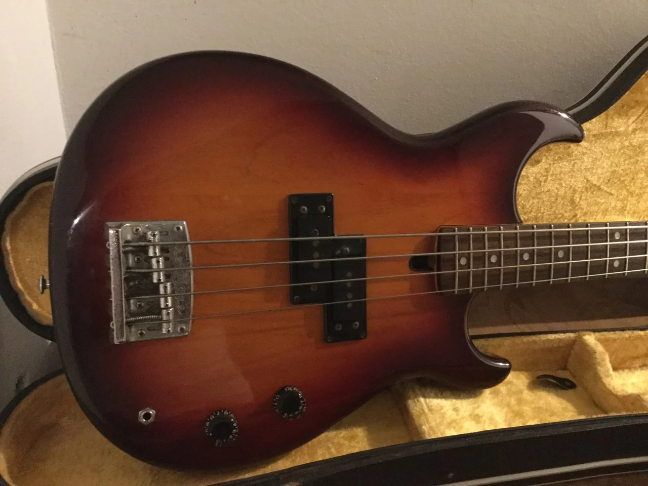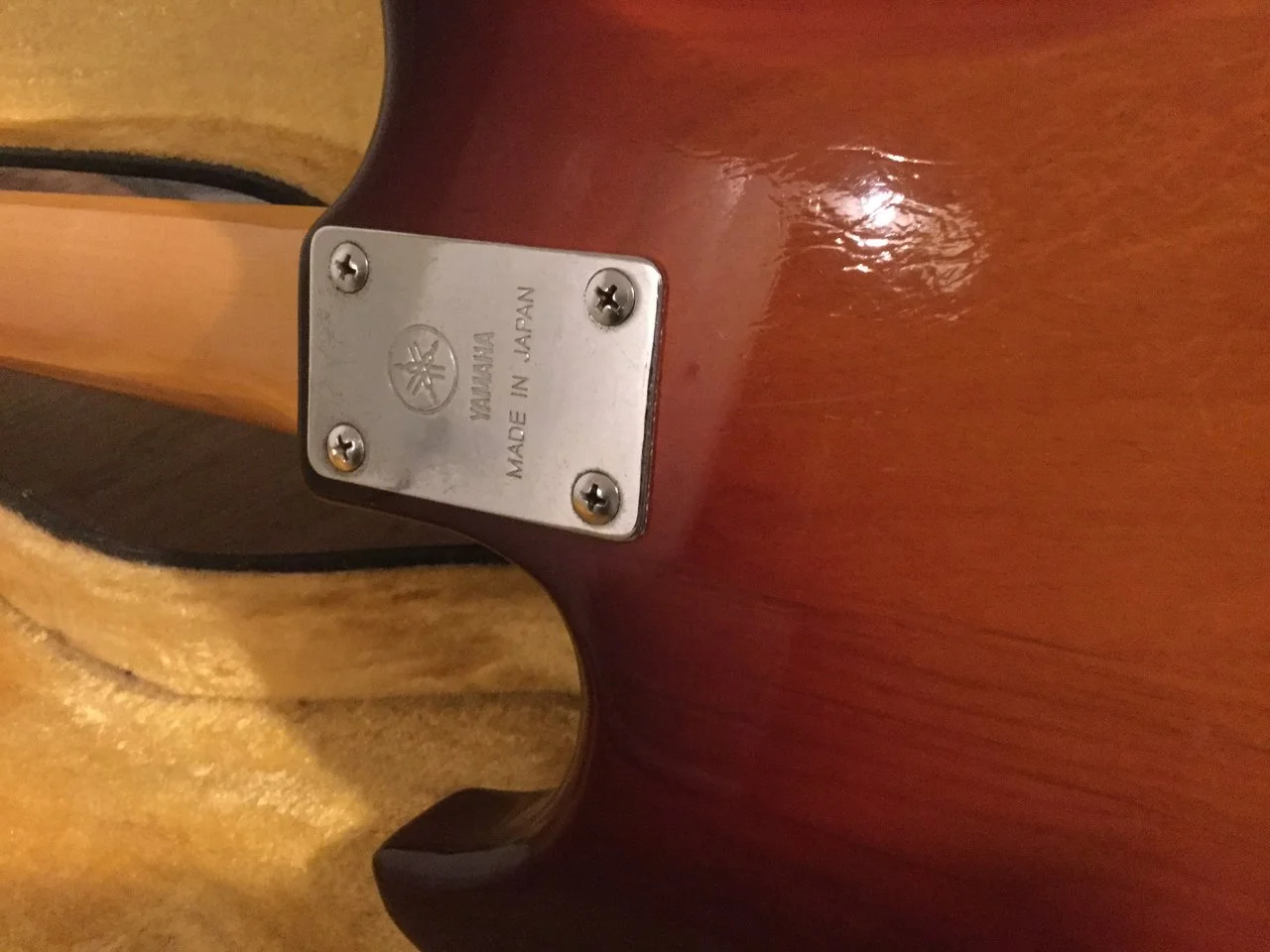 Hier kommt mein cooler Yamaha Broad Bass aus den 80‘ern mit dem reversed Precision Pickup in wunderschönem Sunburst.