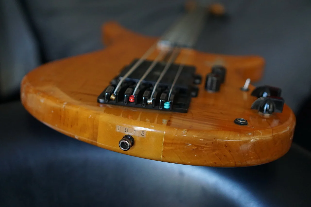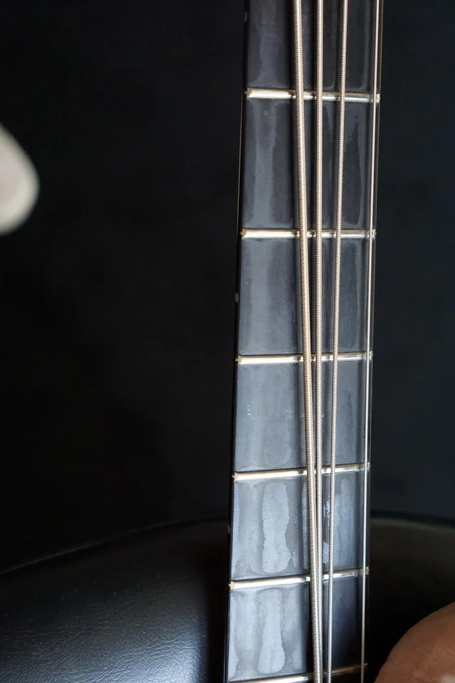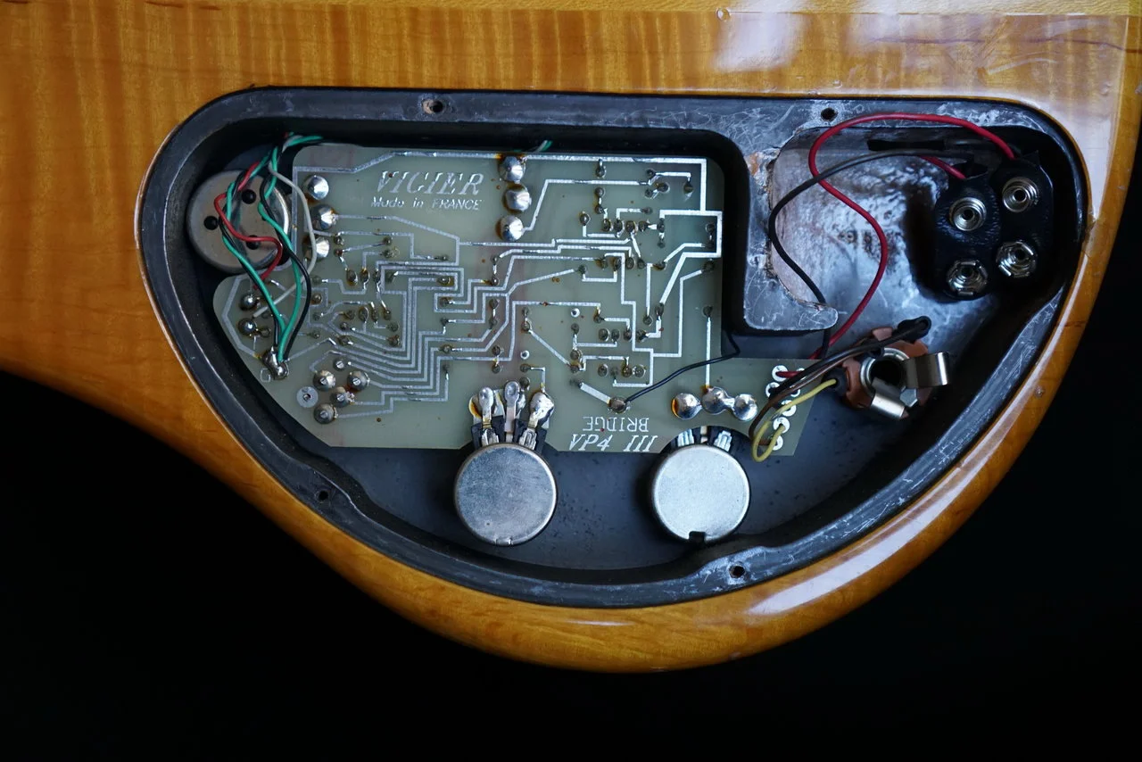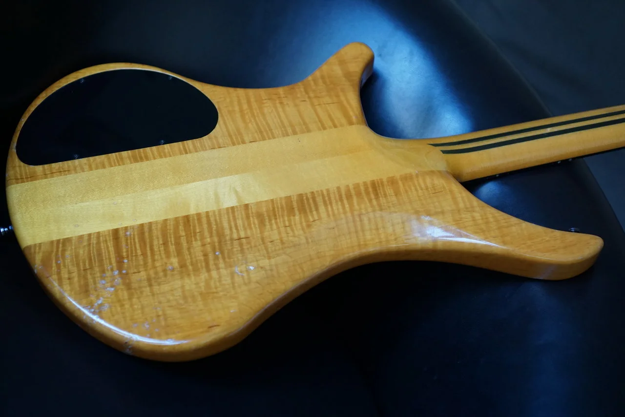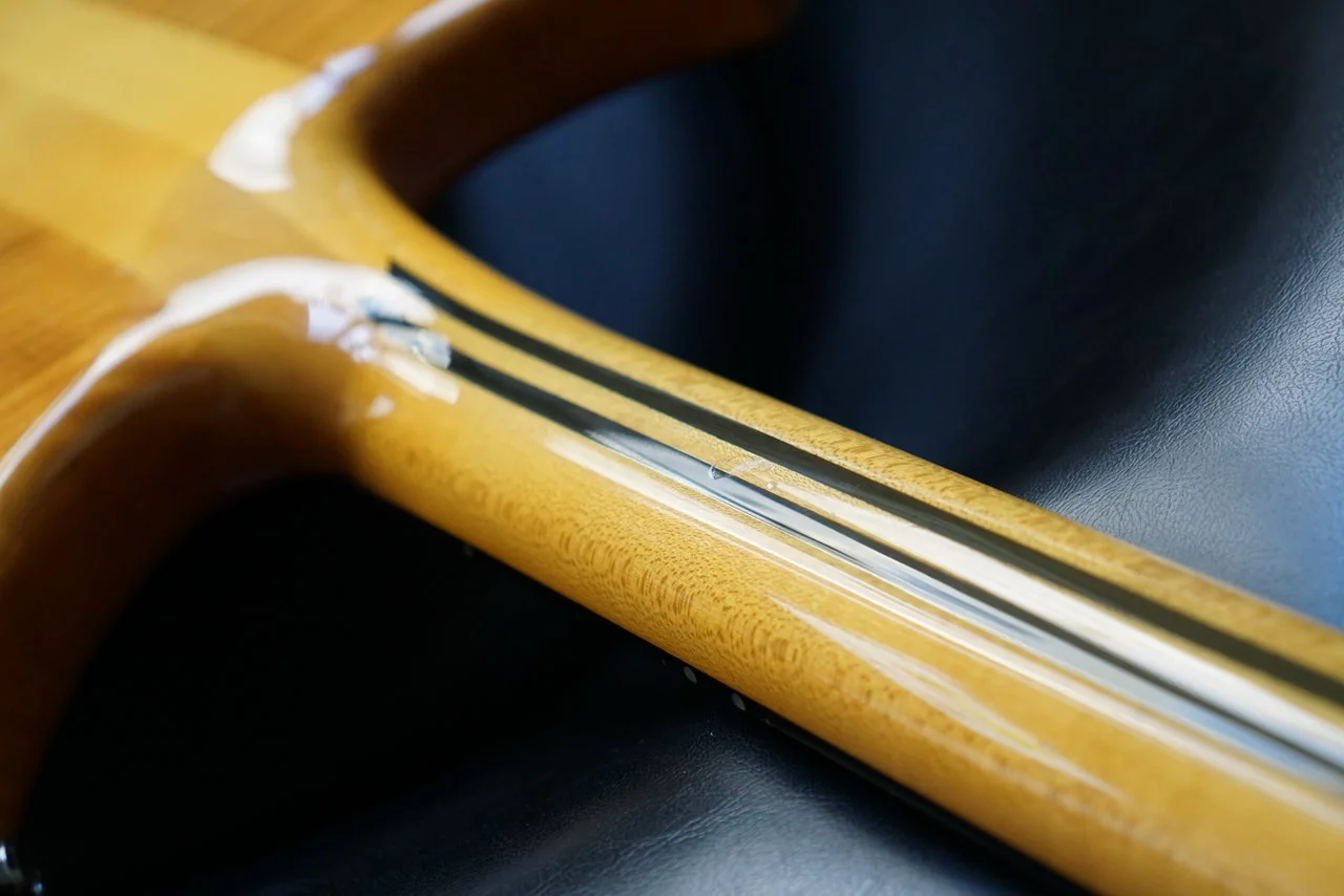 Am Korpus im wesentlichen oberflächliche Lackschäden, am Kopf auch tiefere Kerben. Am Hals hinten (Höhe 13ter Bund) nur oberflächlich der Klarlack ab. Bünde gering abgespielt.