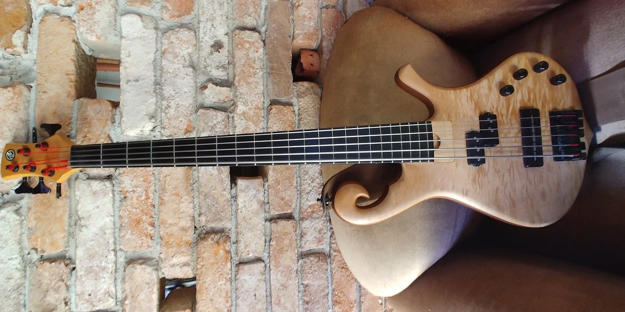 Ales Vychodil PJ custom (https://www.avbasses.com/en/). Two-piece Mahogany chambered body with a flamed maple top, maple neck with an ebony fretboard. Ales Vychodil originally built it for me in 2004 as a fretless with a piezo bridge pickup, then he put the frets, as well as amazing Nordstrand pickups (the Big Blade at the bridge is the beast) on it three years ago. Currently passive with Vol-Vol-Tone configuration, the fourth pot is not wired, but there is a lot of room for an onboard preamp. The bass is in great shape for its age. Always took good care of it, but of course, there are some minor dings on the body. Although it doesn't have the Fender body shape, given the pickup combination, it has an authentic PJ sound (compared to ash/maple P, it is probably a bit warmer and mid-focused though). Lately, I found myself much more comfortable with four-string basses, and it doesn't get much playing time anymore. So I put it up for sale or trade for some interesting four-string (ideally PJ or MM pickup configuration). Shipping within EU included.