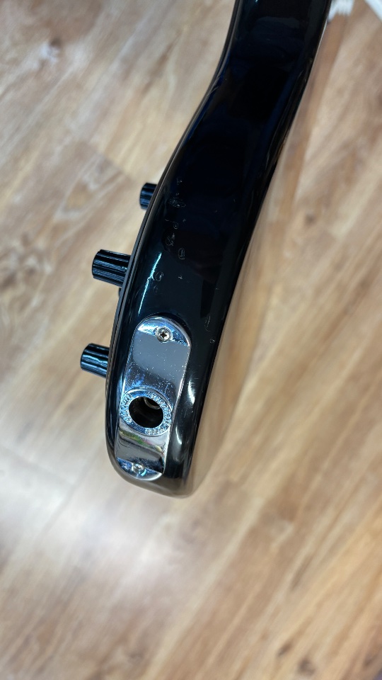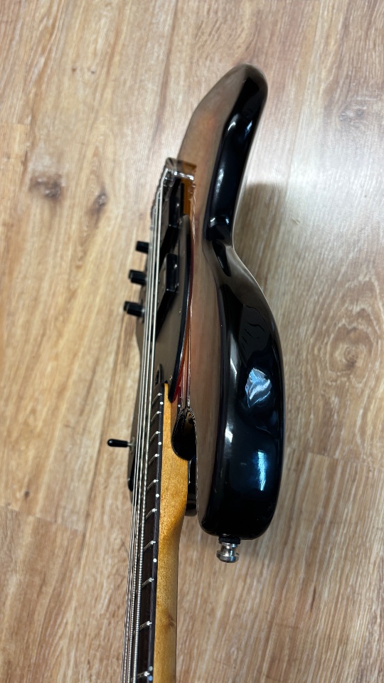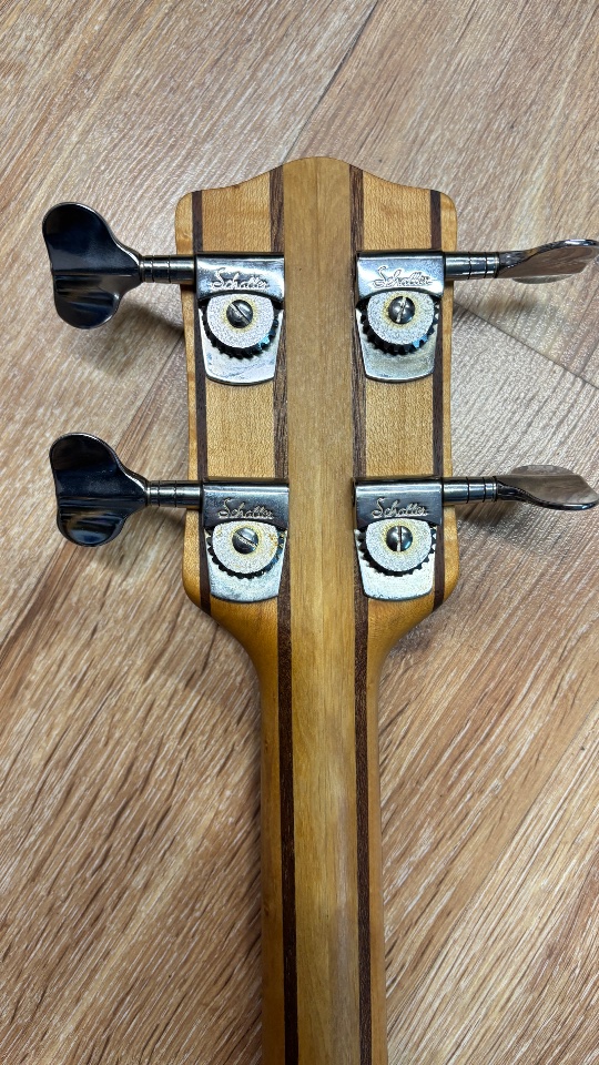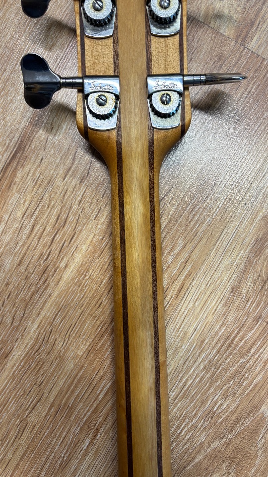 Im Zuge einer geöffneten Leimfuge im mehrstreifigen WAL-Hals wurde der Hals fachgerecht komplett neu verleimt, spannungsfrei ausgerichtet, neu bundiert und das Griffbrett frisch geölt. Diese offenen Fugen zwischen der Silberbirke als Mittelstreifen und dem seitlichen Ahorn ist nicht selten und häufiger zu sehen bei alten WAL‘s