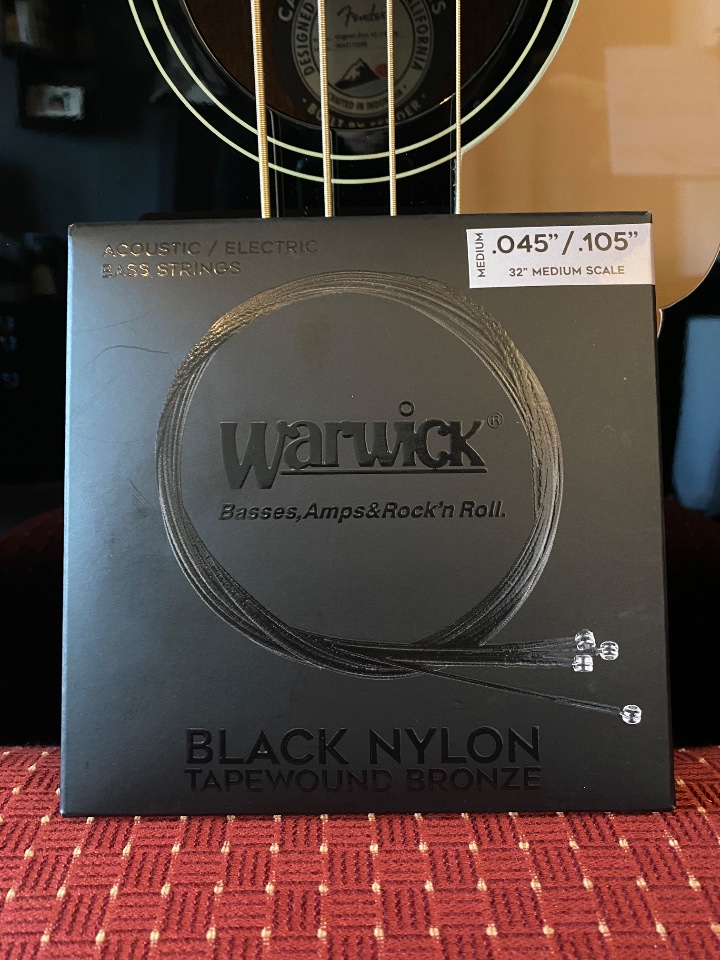 Die Saiten hatte ich testweise letzten Monat neu erstanden, speziell wegen der schwarzen Beschichtung. Sie waren rund 10 Tage auf einem Fender Kingman Akustik Bass aufgezogen, sind so gut wie unbespielt, mussten aber Nanoweb Saiten von Elixir weichen. Die E-Saite wurde um annähernd 3 cm gekürzt.