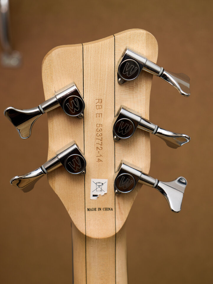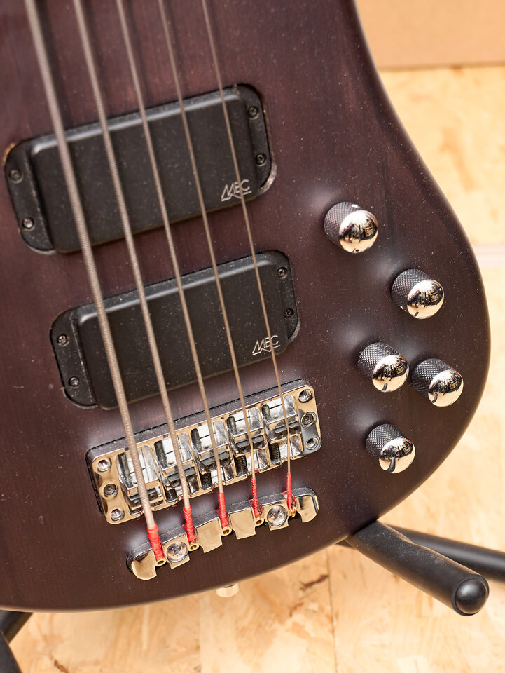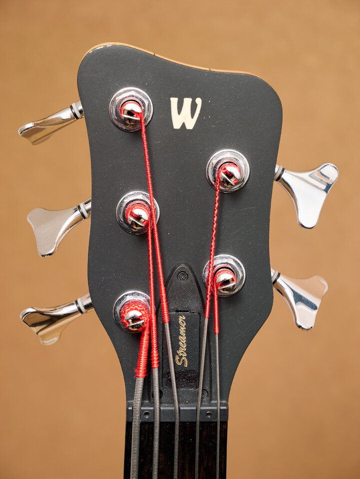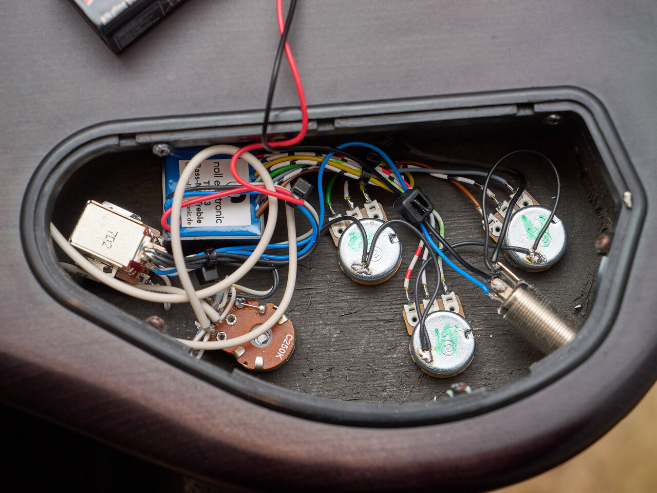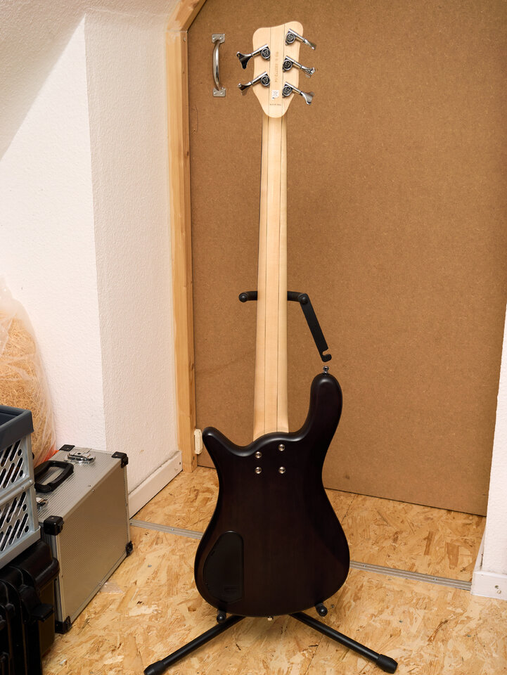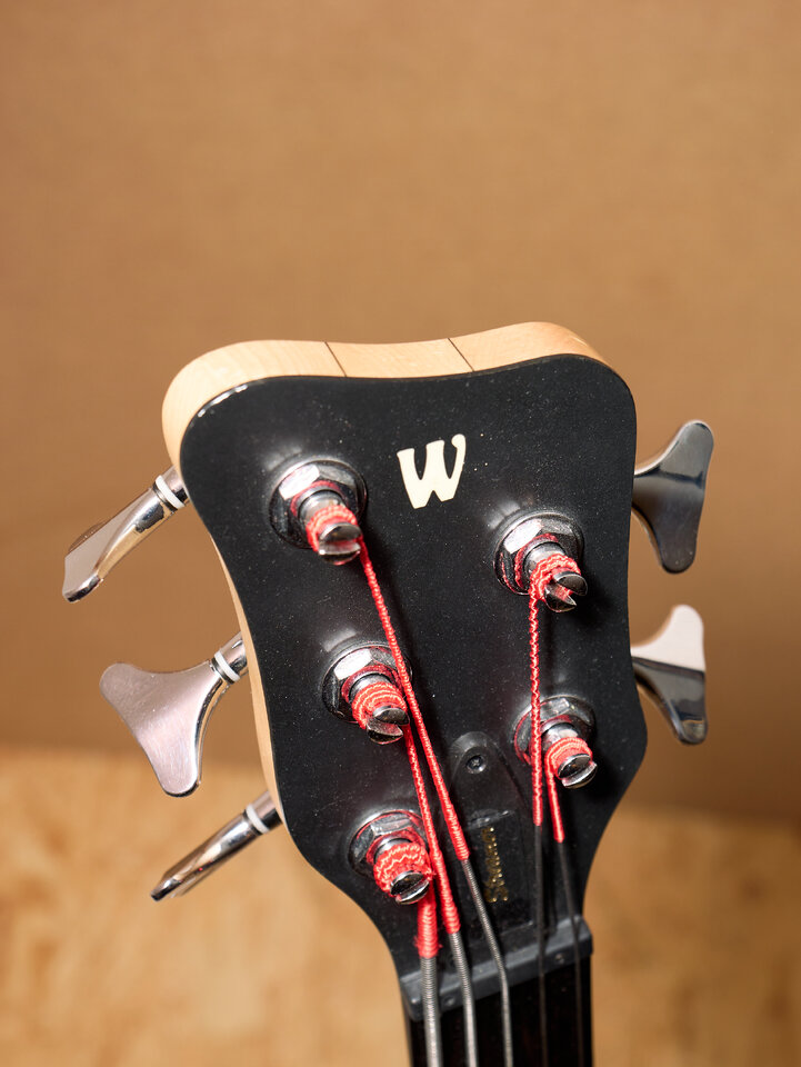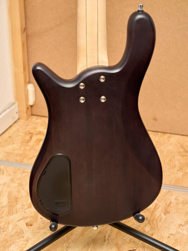 Das Griffbrett ist Tigerstripe Ebenholz. Bodyholz weis ich nicht. Der Bass war ursprünglich passiv, ich habe um den Jahreswechsel rum eine Noll TCM3 Elektronik nachgerüstet. Die Batterie liegt Schaumstoff gepolstert im E-Fach. Das E-Fach hat den für Warwick typischen Deckel aus Kunststoff mit Schnellverschluss.