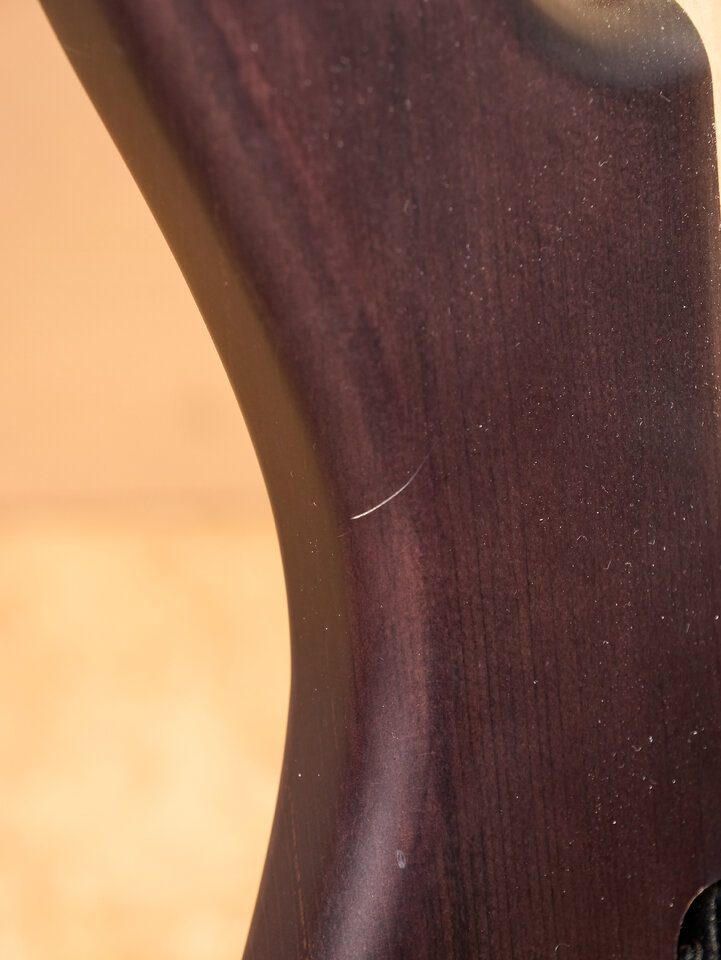 Der Bass ist in gutem Zustand, ein paar kleine Ding und Dongs, siehe Bilder. Das Griffbrett hat minimale Spuren vom kurzzeitigen Einsatz mit Roundwounds.