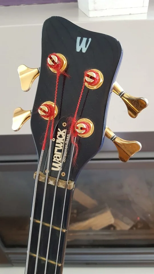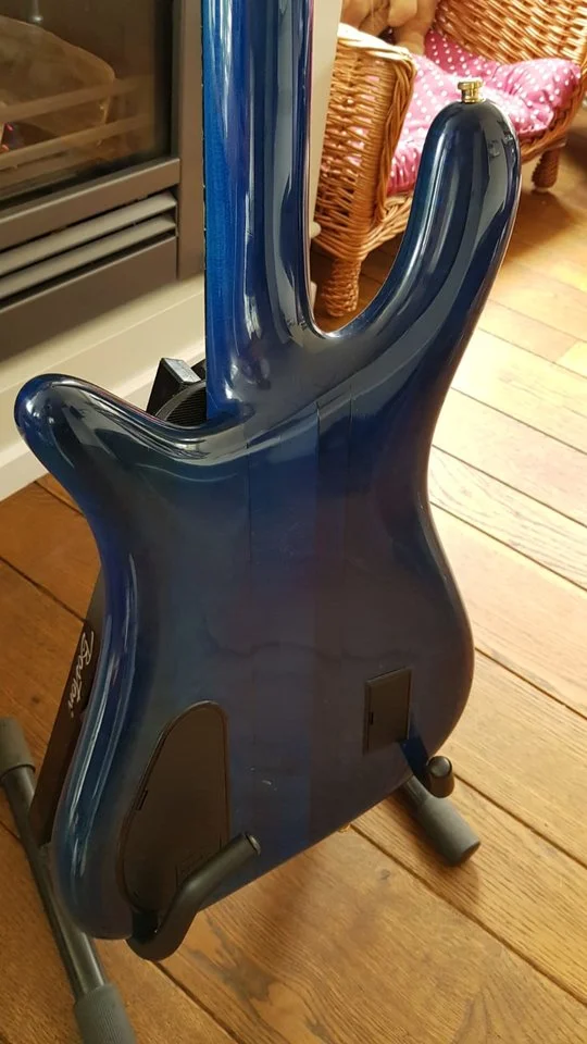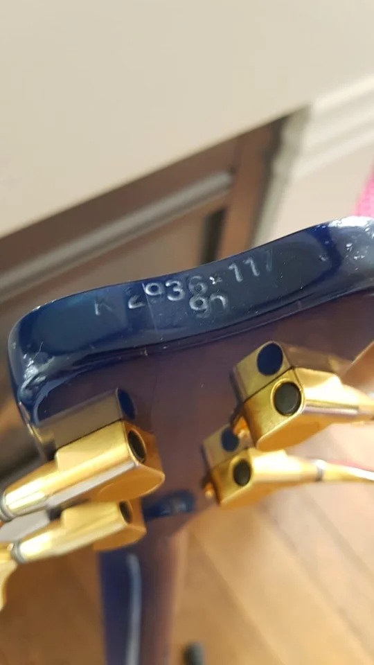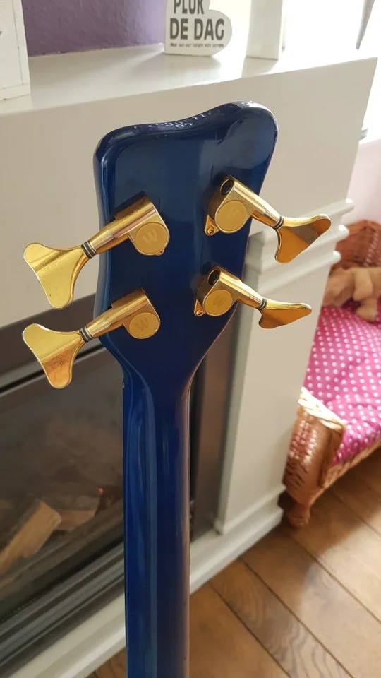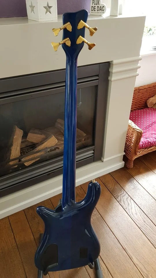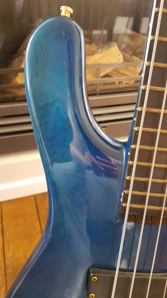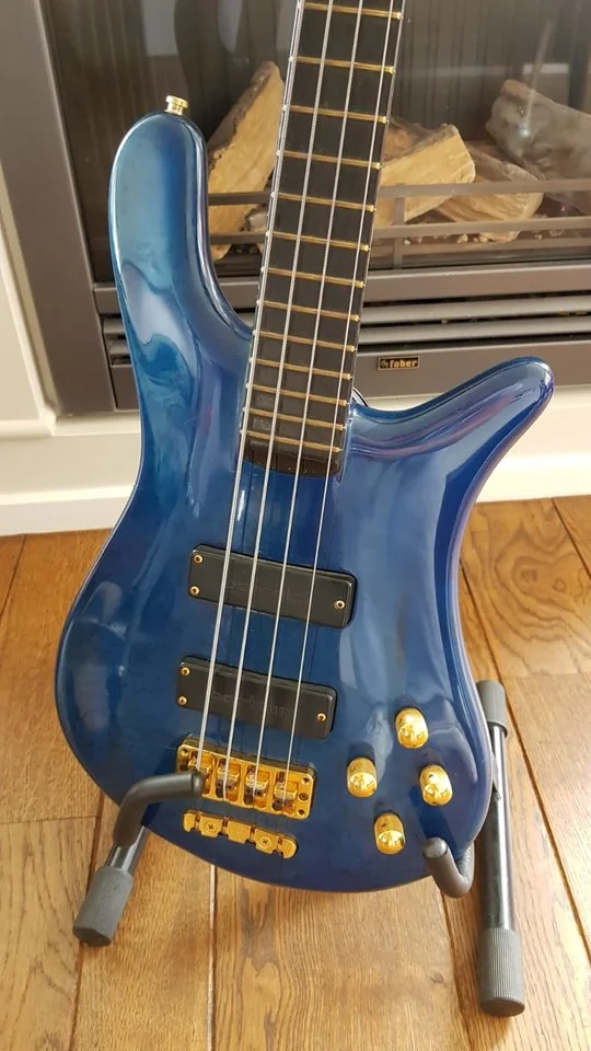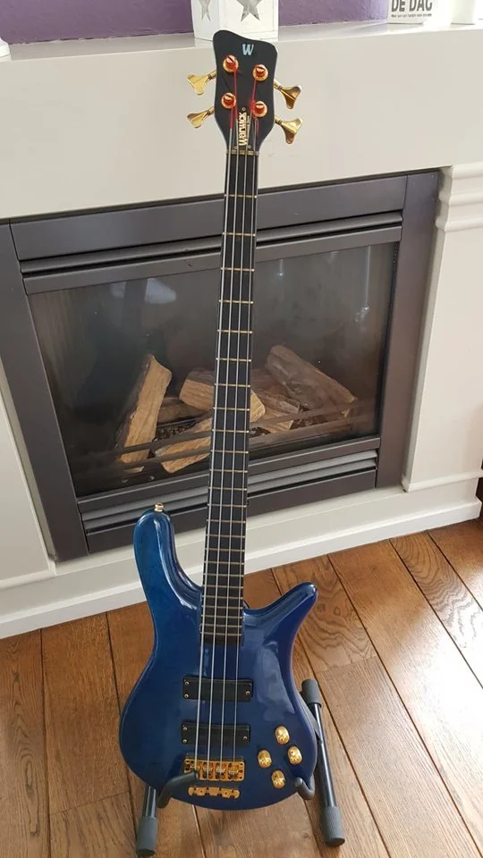 Limited edition Warwick from 1990. It has a blue finish, Bartolini pick-ups, an ebony fretboard and a nice birdseye maple top. A truly spectacular Warwick. It's still in a good condition and sounds wonderful.
