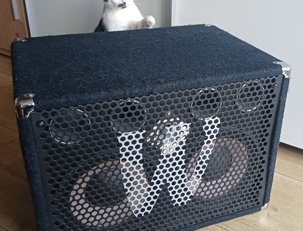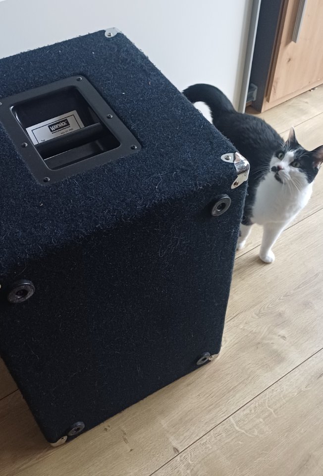 Wie ihr auf den Fotos sehen könnt, sind wir ein Katzenhaushalt und so eine Filzbox ist natürlich wahnsinnig spannend. Leider gibt es daher eine Stelle oben, wo das Krallenschärfen dazu geführt hat, dass der Bezug nicht mehr ganz am Holz klebt und das Filz dort etwas aufgerauter ist. Löcher gibts aber keine. Ich habe das einige Wochen nach dem Einzug unserer Katzen bemerkt und der Box dann aus Stoffresten eine passende (Staub-)Hülle genäht, wodurch ich das Kratzen unterbinden konnte. Seit über 7 Jahren (mit Ausnahme von 2-3 Bandproben) nur noch zuhause im Nichtraucherhaushalt zuhause verwendet. Wurde 2023 auf Herz und Nieren durchgecheckt.