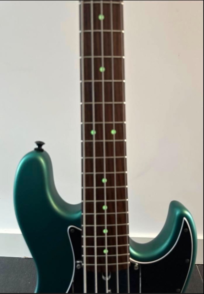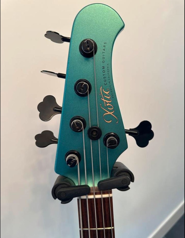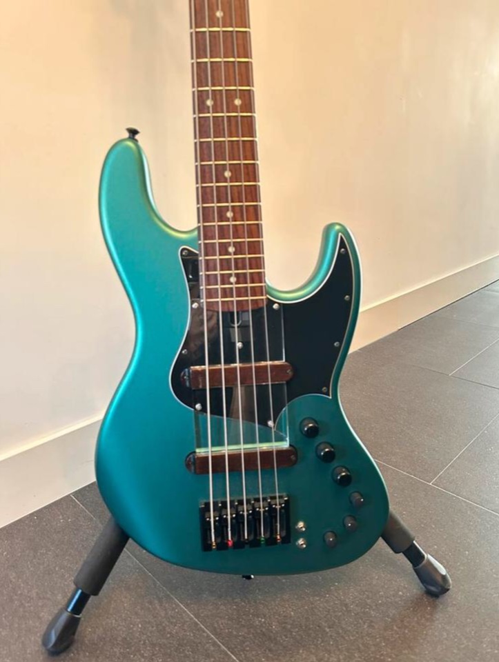 Made in Japan Xotic XJ 5 string in Sherwood Satin green. With Luminova fret marks. Dunlop strap locks. In very good condition. It is tuned E, A, D G, C.