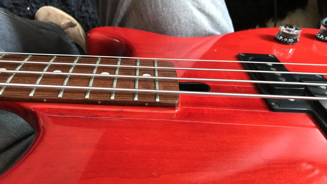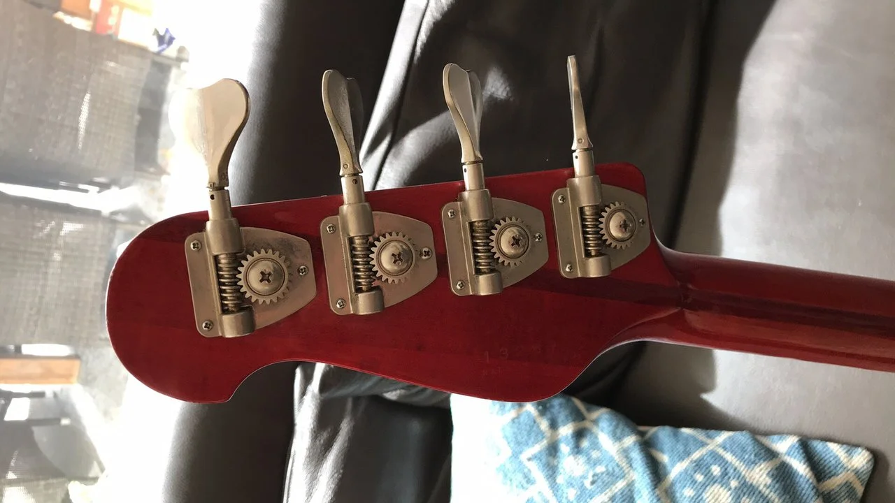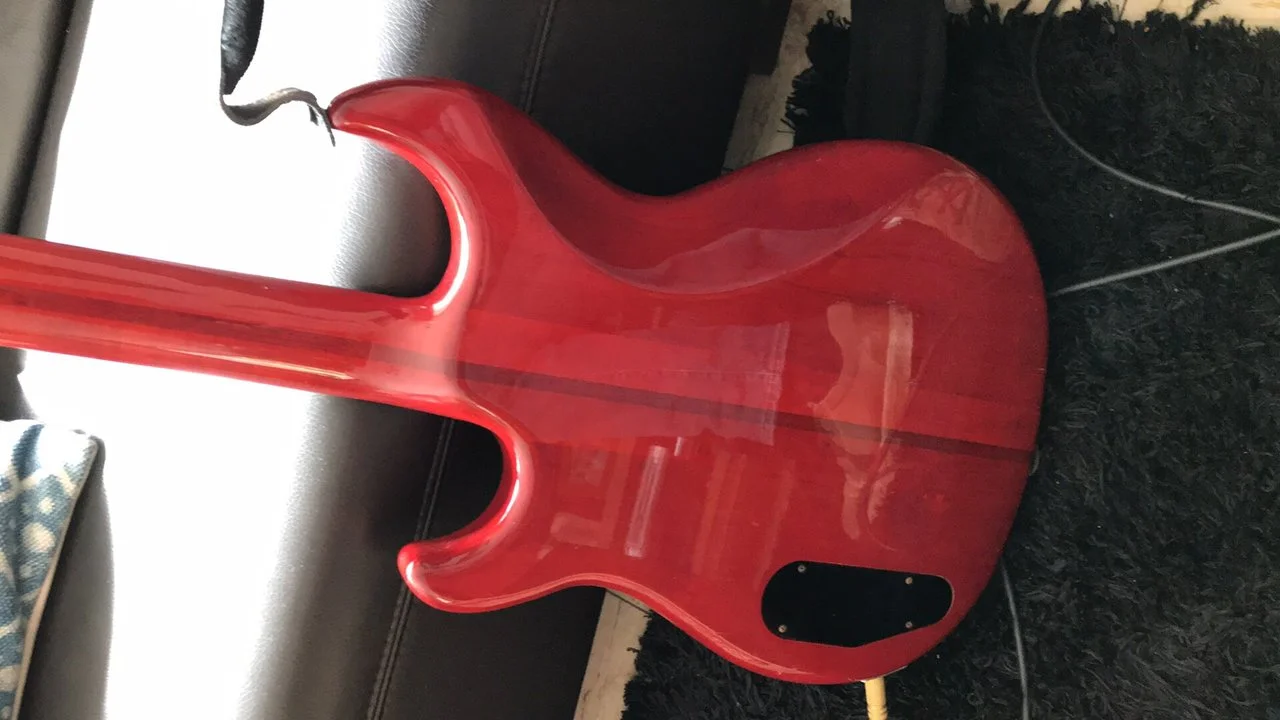 Neckthrough, transl. red, ungefahr 4.6kg, ist neulich abgesteld, fretboard geoelt und neue saiten drauf gemacht.