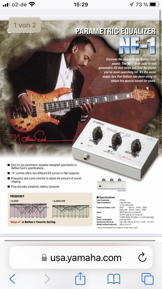 Hallo Bassgemeinde, ich verkaufe hier meinen fast schon legendären Yamaha NE-1. Schöner semi-parametrischer EQ, der wählbare Frequenzen leicht oder stark absenkt. Gerade für Jazz Bässe, aber auch Precis liefert das Teil tolle Sounds ab. Top Zustand. Gehört eigentlich auf jedes Soundboard. Nathan East kann sich nicht irren!!! Potis laufen schön Sahnemässig, nix knistern. Mit OVP