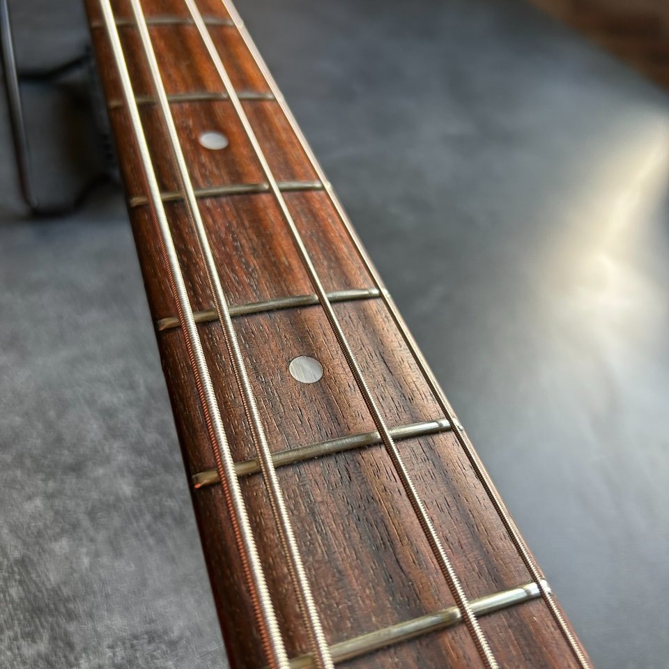 The bass has just been serviced by a luthier – the frets have been dressed, the nut has been adjusted, and the jack has been replaced. It's very comfortable, with a 1.6mm action at the 12th fret. The hardware and truss rod work perfectly. Visually, there's one large ding on the side, and other signs of normal wear.