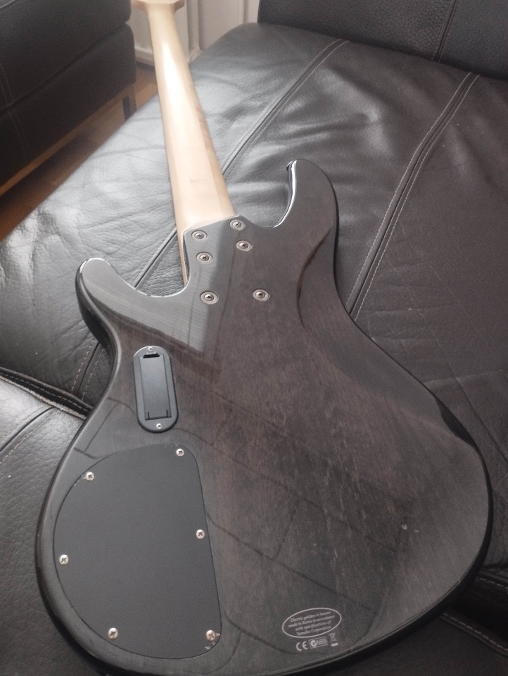 Der Bass hat einige Auftritte mitgemacht, ist aber noch gut erhalten. Lediglich eine Macke befindet sich auf der Rückseite des Bodys. Ich habe versucht, dieses auf dem Foto festzuhalten. Bei der Maserung/Lackierung fällt diese aber gar nicht so auf.