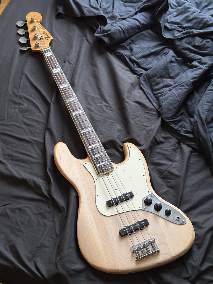 Ich habe die Elektrik probeweise eingebaut und verdrahtet, alles funktioniert, die Pickups sind über die Jahre nur leicht entmagnetisiert worden, haben ausreichenden Output und klingen schön „broken in“. Die Potis arbeiten sauber, nur die Höhenblende kratzt ein wenig. Was soll ich sagen, das Teil klingt fantastisch, trotz gebrauchter Saiten sustain for daaaaaaaaays….