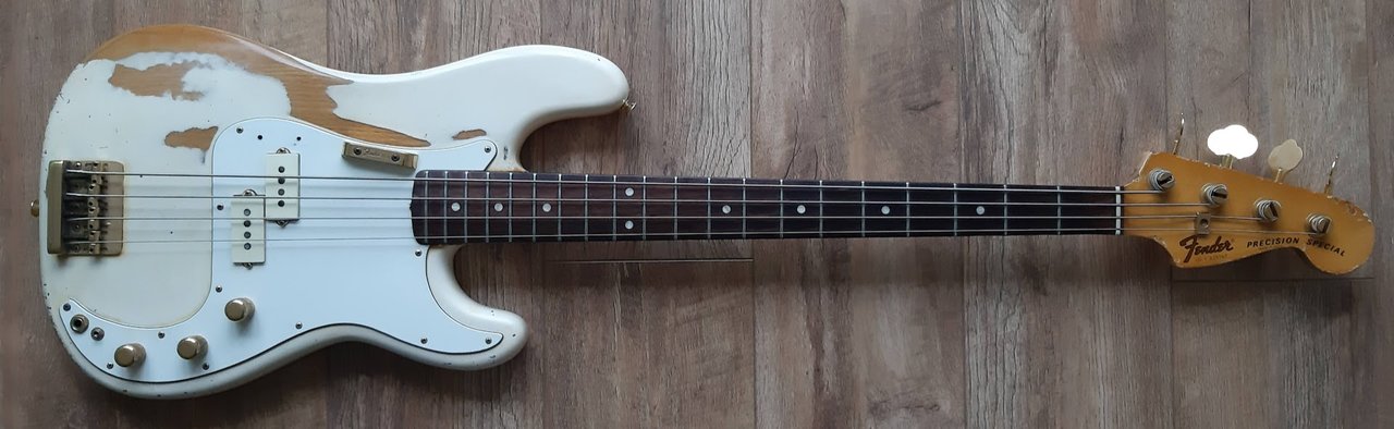 1982 Fender Precision Special, ash body, rosewood neck. The color would have been Arctic White according to the catalog, but as you can see this bass has seen it all - I got it from the first owner - a session musician, who did play on it every day for almost 40 years and it shows . I do not know where to start with the roadworn part, but as can be seen - finish is worn almost everywhere, lacquer on the neck is gone in many places, there are numerous...