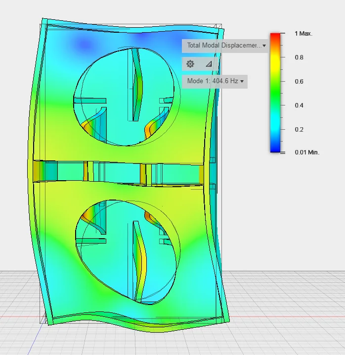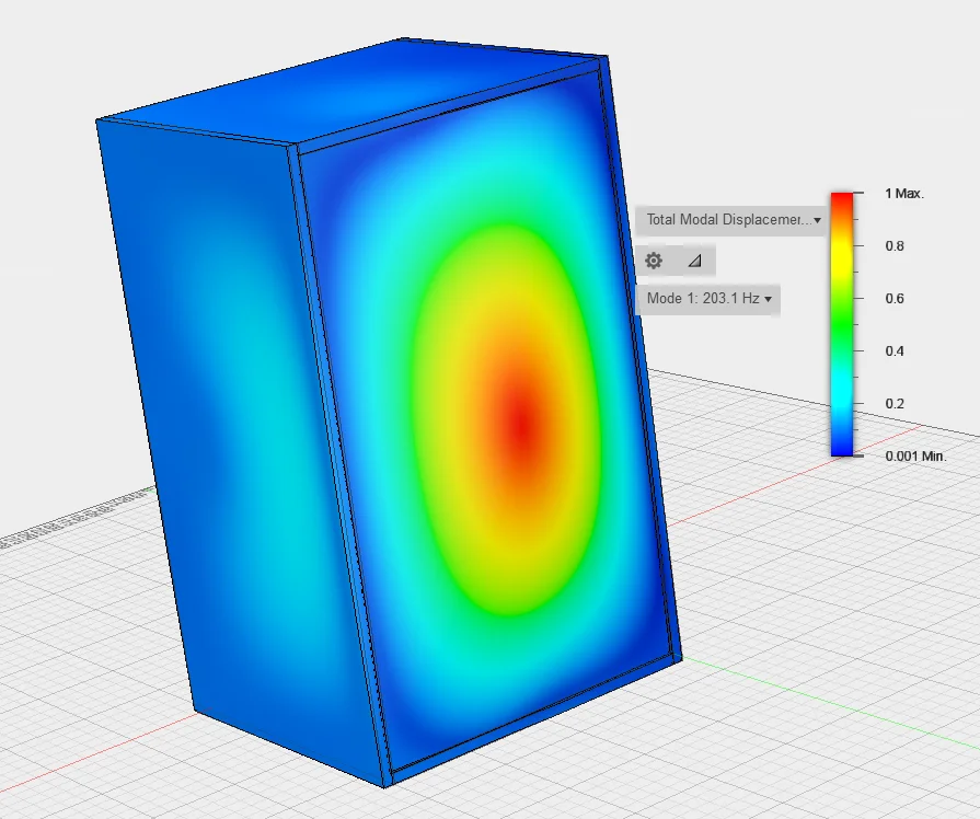Ich hab das ganze aus Spaß mal etwas gerechnet. So sah die niedrigste Eigenfrequenz mal ohne (linkes Bild, Box von hiten) und mit Versteifungen (rechts - Box von vorn) aus. Bei der unversteiften Variante ein Bild der Rückwand, da ist wohl klar, was passiert..