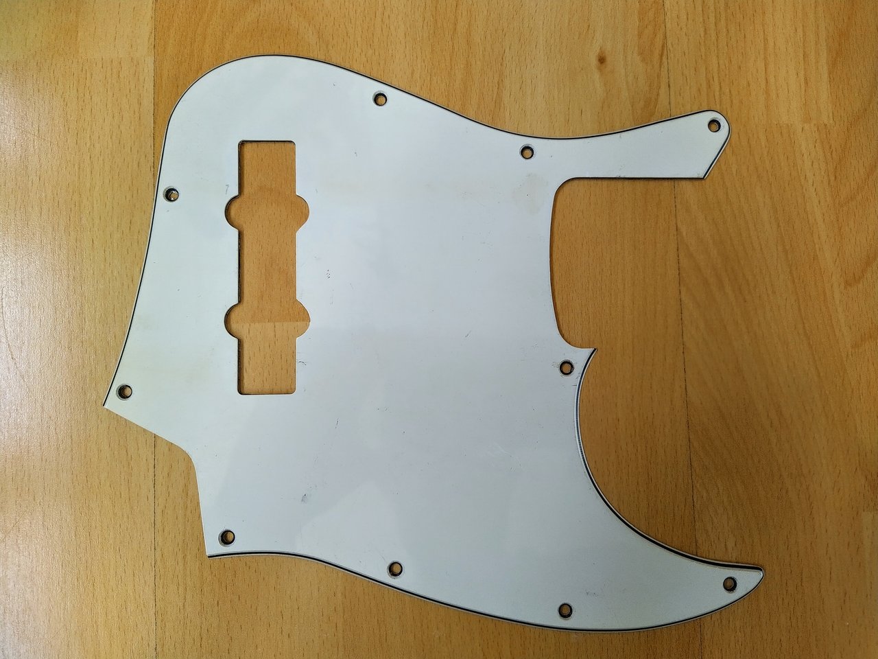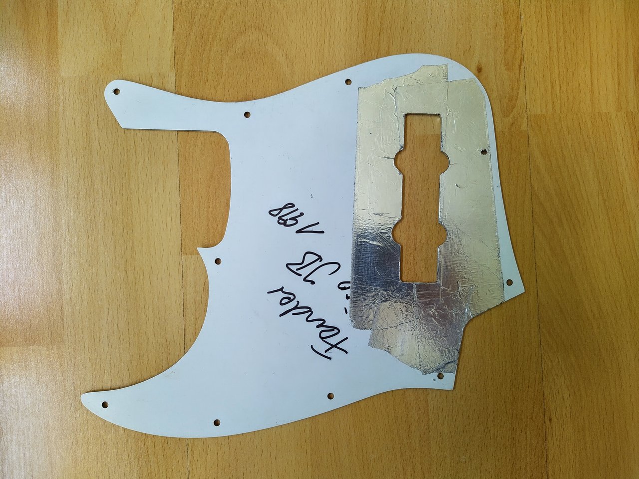 Das Pickguard hat auf der Oberseite einige Kratzer und ist auch schon ein bißchen vergilbt. Es stammt von einem 1998er Fender Jazz Bass.
