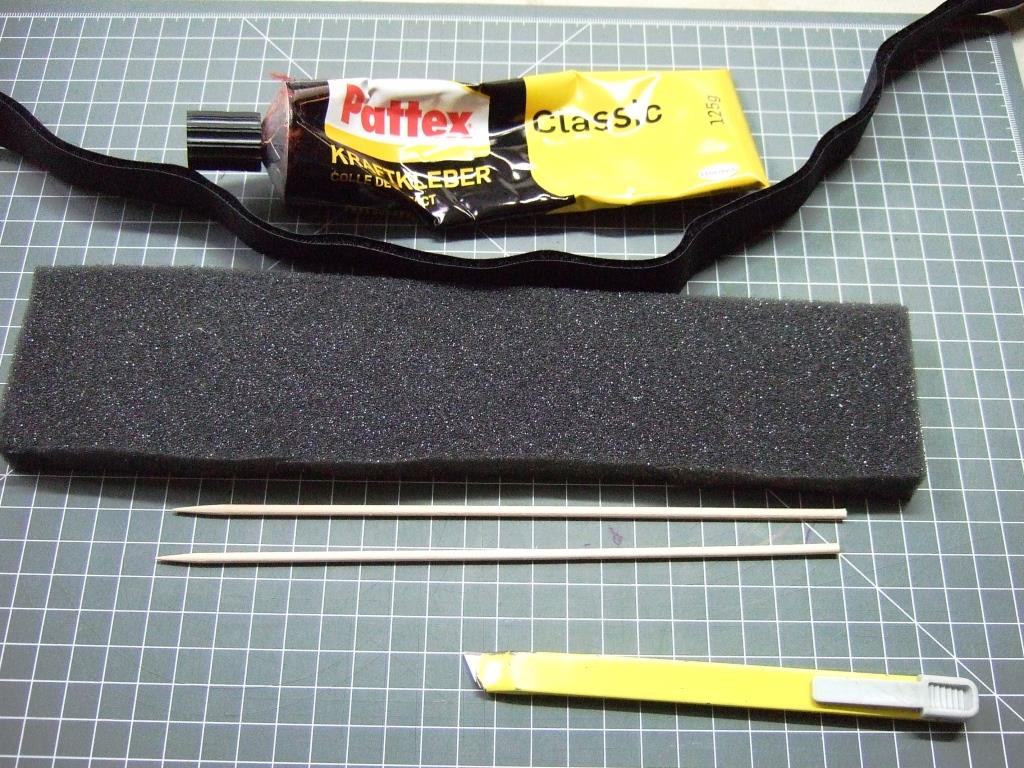 Pattex, Schaumstoff, Klettband Haken und Flausch, Cutter, Blumendraht: