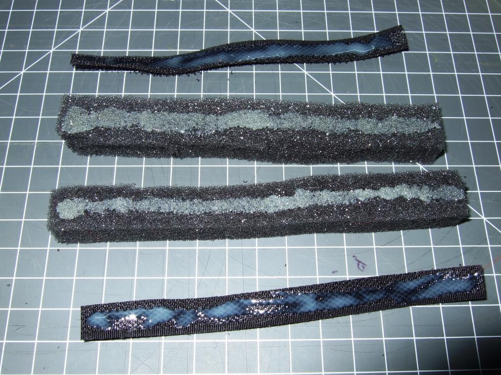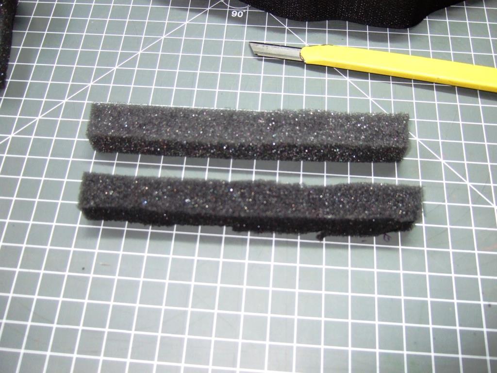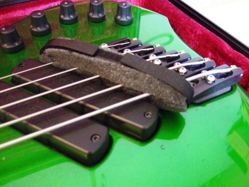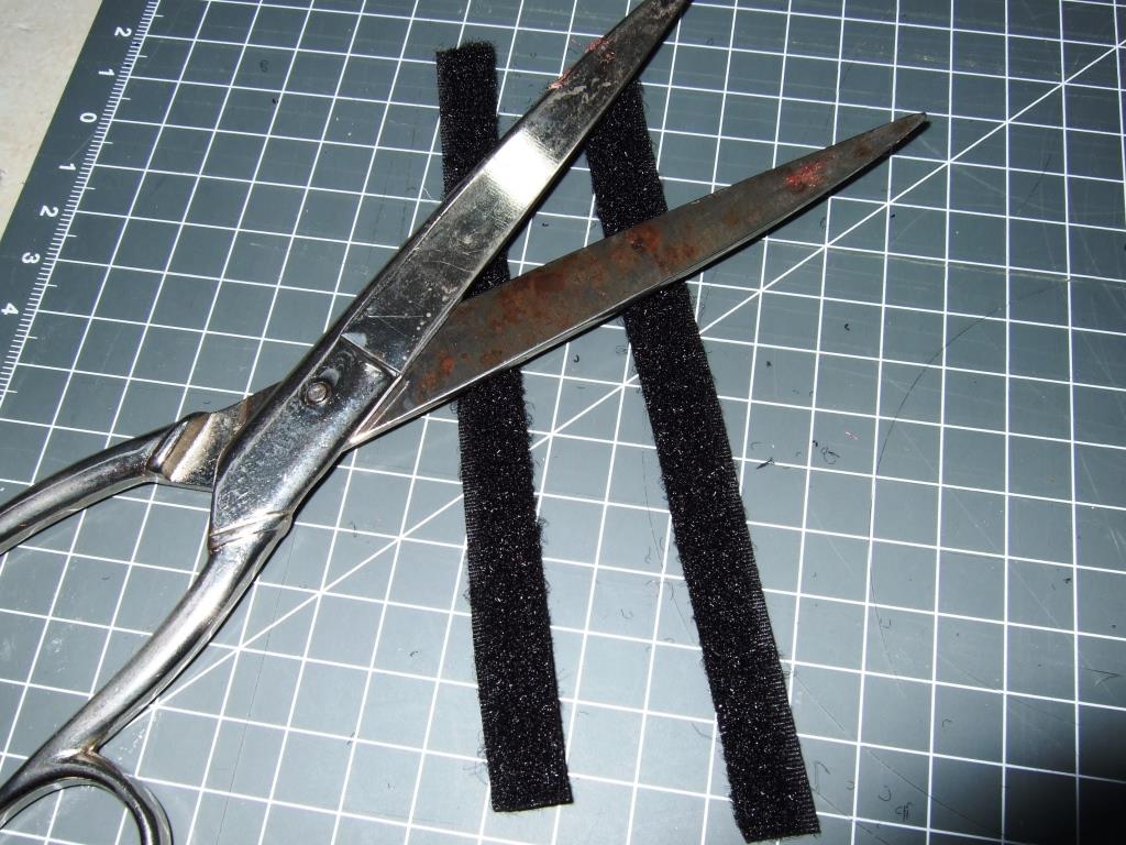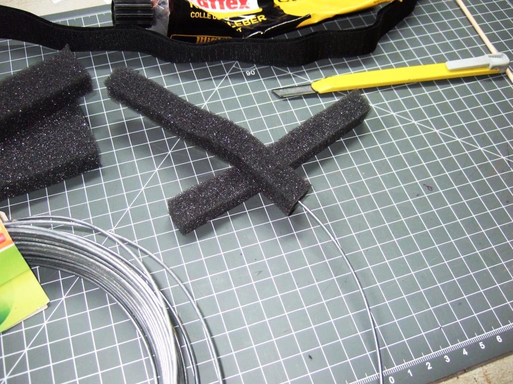 Zwei 10mm Streifen schneiden. Weicherer Schaumstoff dämpft nicht so krass, liegt dann aber konstuktionsbedingt nicht gut auf den mittleren Saiten auf. Ein Stück Draht hineinstecken, dann kann man sogar die individuelle Saitendämpfung "hinbiegen". Klettband Haken zuschneiden und mit Pattex aufkleben.