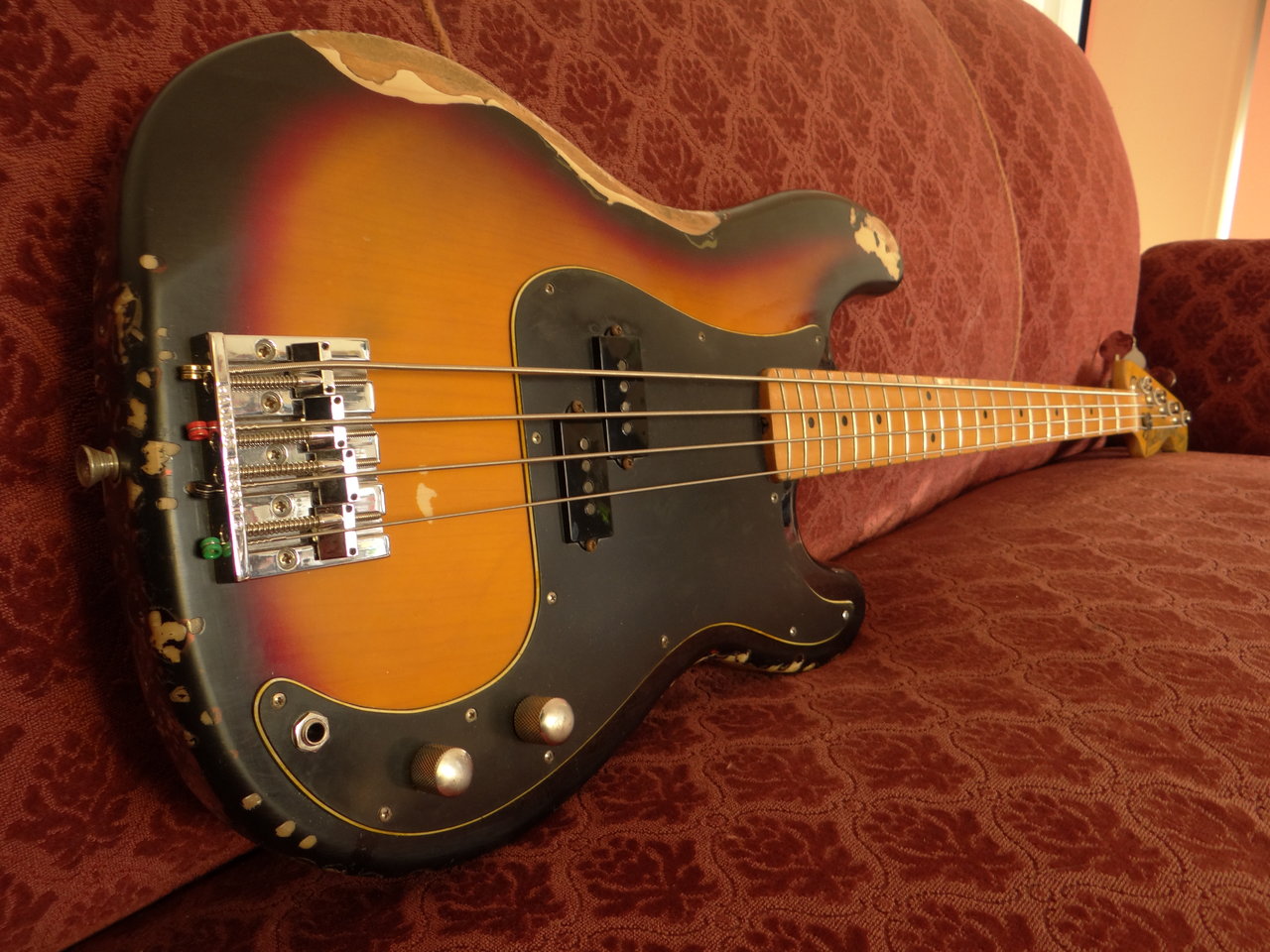 Fender Mexico aged by me, Aged Pickguard, Preci Neck aus USA(irgendeine Japan Copy) Fender Roas Worn Pickup, BadAss II aus USA für ich glaube nicht mal 45 € inkl. Zoll, der Dollarkurs war ein super(nicht so niedrig wie Mitte 2016, aber Ok) und die Preis für Parts in USA sehr niedrig.
