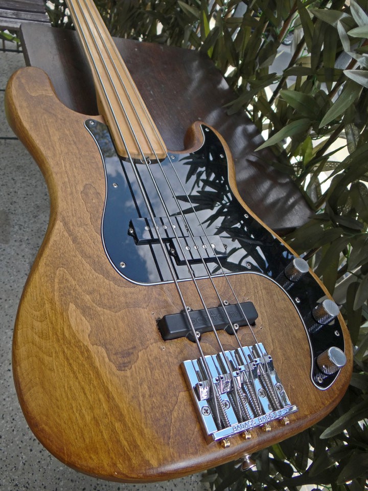 1978er Fender Precision Fretless Neck aus USA für 490 €, den Hals habe ich auf JazzBass Maße (38mm breit und dünner!) geraspelt, gefeilt, mit einem hohen Einsatz an Blut, Schweiß und Tränen, dazu einen Messing 38mm Sattel