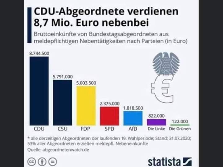 Und das sind nur die offiziellen Zahlen...Im Pro-Kopf-Schnitt haben die 244 CDU/CSU-Fraktionmitglieder also gut 59.500 extra und nebenbei verdient.
