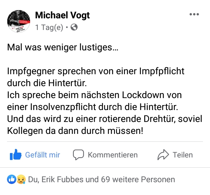 Sind es nicht offensichtlich diejenigen, die mit Ignoranz, Egoismus und jeder Menge Fehlinformation, Desinformation, wissenschaftlichem Quarkdenken und sonstigen Hirnschiss dafür sorgen, dass uns die Pandemie länger als nötig erhalten bleibt?Nun, dann kann ja Herr Vogt mal überlegen, wer ihm diese Drehtür einbrockt.