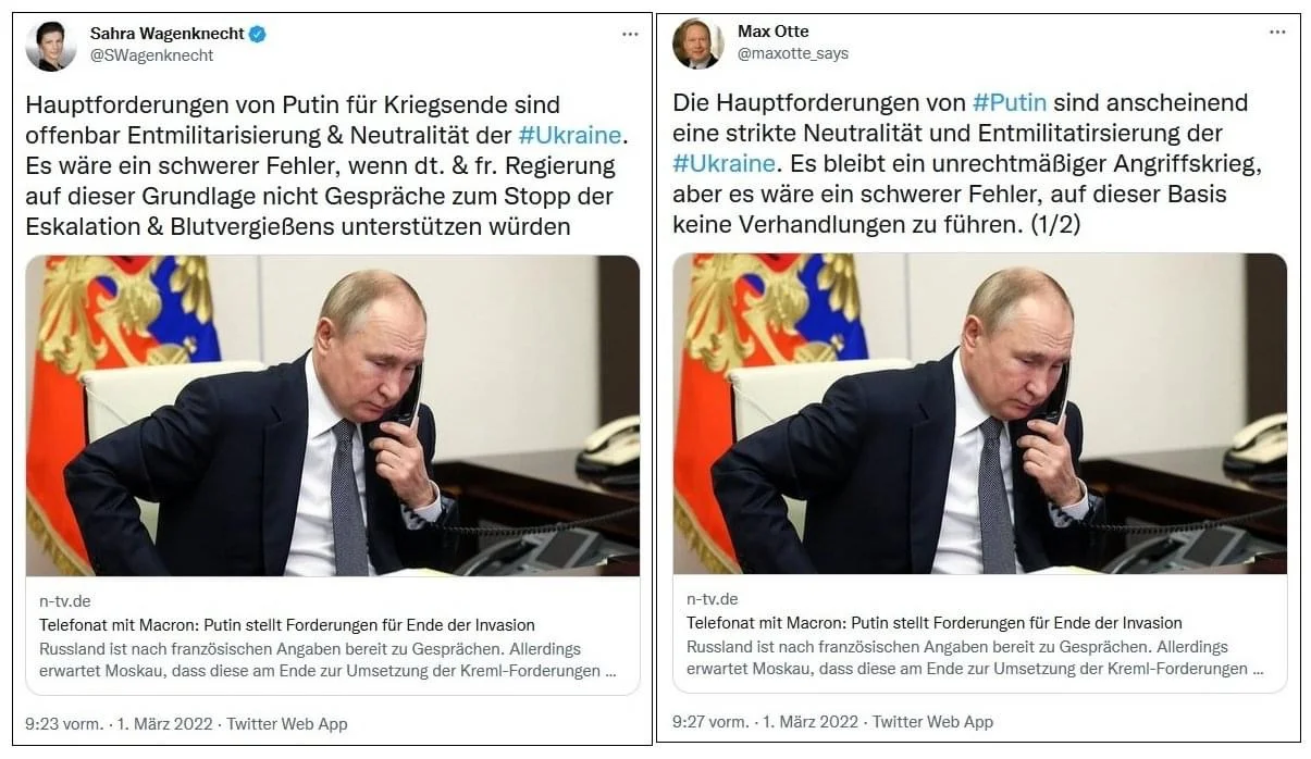 Wenn der Bundespräsidentschaftskandidat für die AfD, Max Otte, fast zeitgleich und fast wörtlich das Gleiche zu Putin und dem Ukrainekrieg schreibt wie Sahra Wagenknecht...