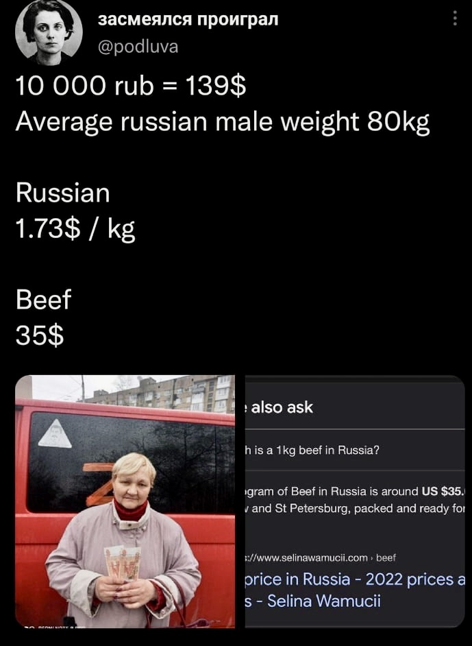 Die Familie eines gefallenen Russen erhält als Entschädigung 10.000 Rubel. Durch die langanhaltende Inflation sind das $139, pro Kilo Russe weniger als für andere Fleischsorten.