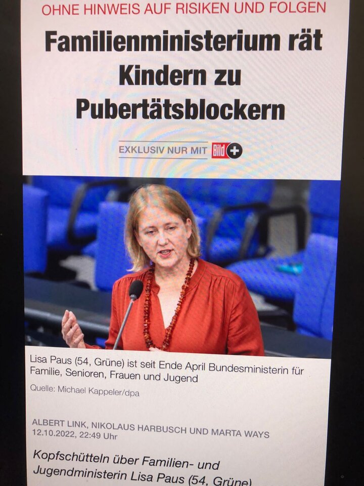 Sorry, aber was ist das denn jetzt schon wieder für ein reaktionärer Müll? Eine stumpfe Behauptung, die Familienministerin rät allen Kindern zu Pubertätsblockern? Sorry, was für ein Schrott. Bei der Seite Regenbogenportal.de handelt es sich lediglich um eine Info-Seite für Jugendliche die sich eventuell ihrem biologischen Geschlecht nicht zugehörig fühlen. Was ist bitte schön schlecht an gesundheitlicher Aufklärung? So wie das hier dargestellt wird ist das politische Agitation "Exklusiv mit Bild+". Tut mir leid, aber sowas gehört in den Keller, da können wir uns gerne darüber unterhalten welche Motivation zum Posten solcher Beiträge führt.