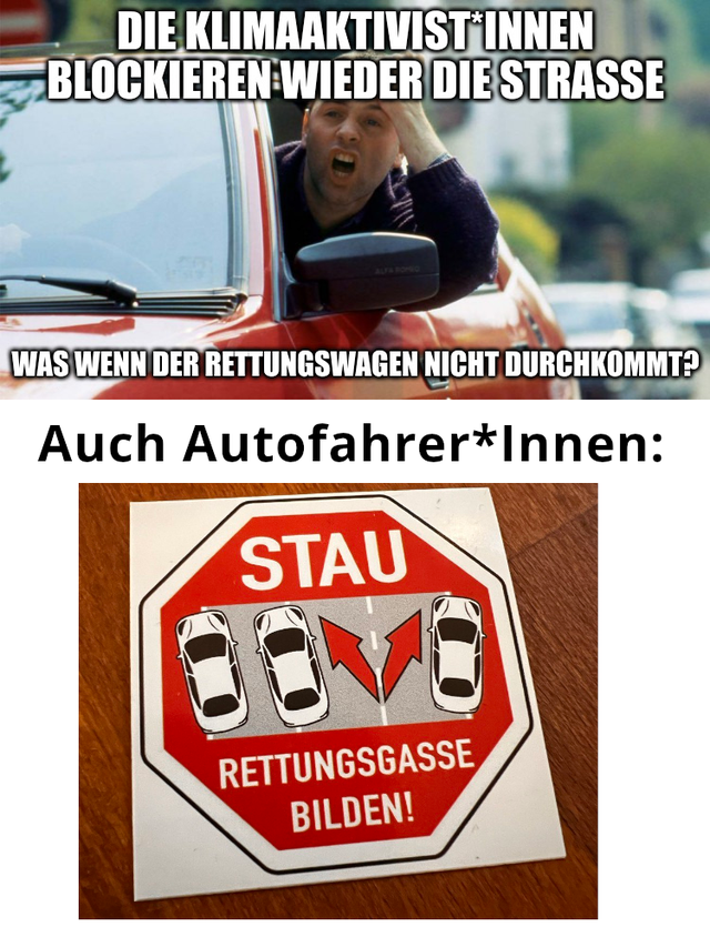 Mit Greta Tunberg Zöpfen aus dem Kofferraum...Das ist ja das geile daran. Die Lutscher, die gegen Tempolimit sind und überall Anti-Fahrrad-anti-Öko-Anti-Grüne-Bildchen posten, solidarisieren sich jetzt mit einer toten Radfahrerin (möge sie in Frieden ruhen) und brüllen Rettungsgasse und schäumen, wenn man darauf hinweist, dass eine Rettungsgasse auch nichts bringt, wenn ein Betonmischer über der Gürtellinie parkt.